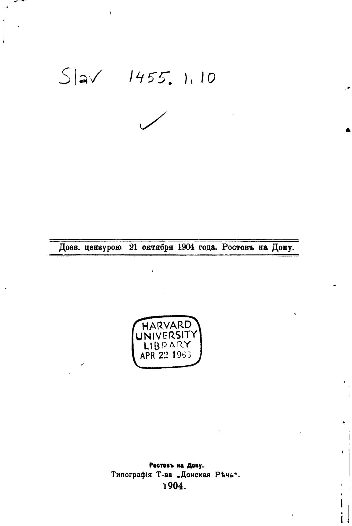 Доев. цензурою 21 октября года. Ростовъ на Дону.