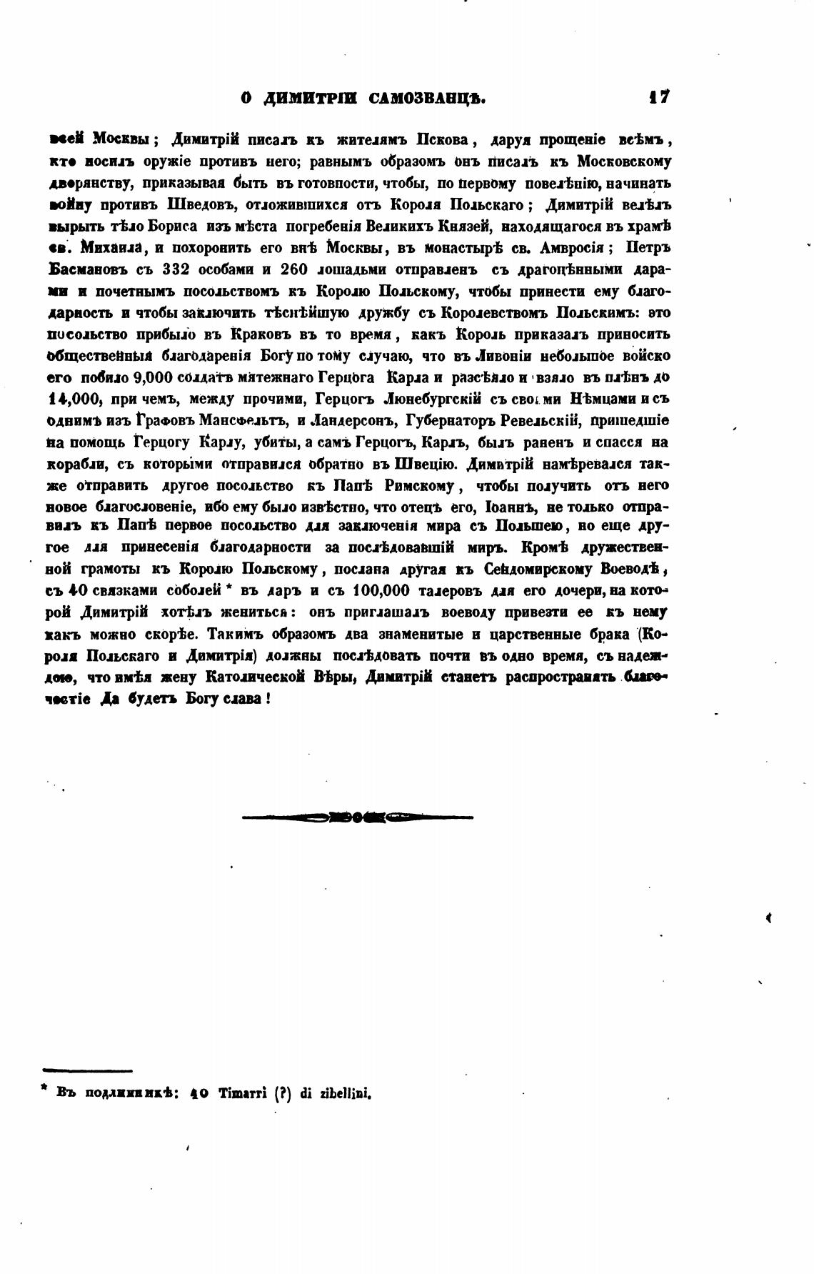 съ 40 связками соболей * въ даръ и съ 100,000 талеровъ для его дочери, на кота