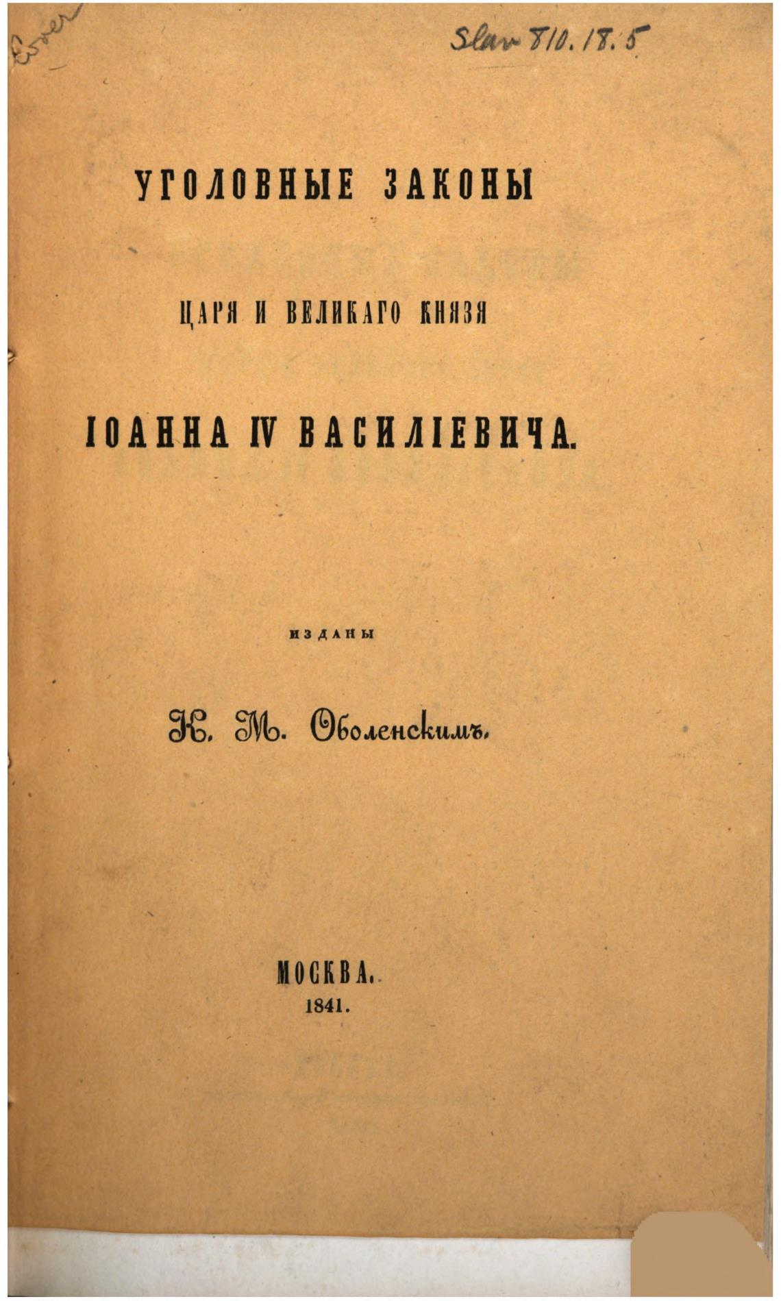 Уголовные законы царя и великого князя Иоанна IV Васильевича. Изданы князем М. А. Оболенским. - Оболенский М. А.
