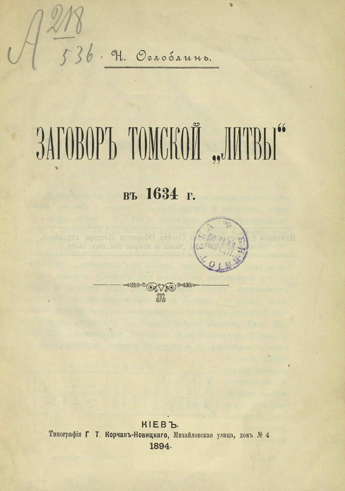 Заговор томской "литвы" в 1634 г. - Оглоблин Н. Н.