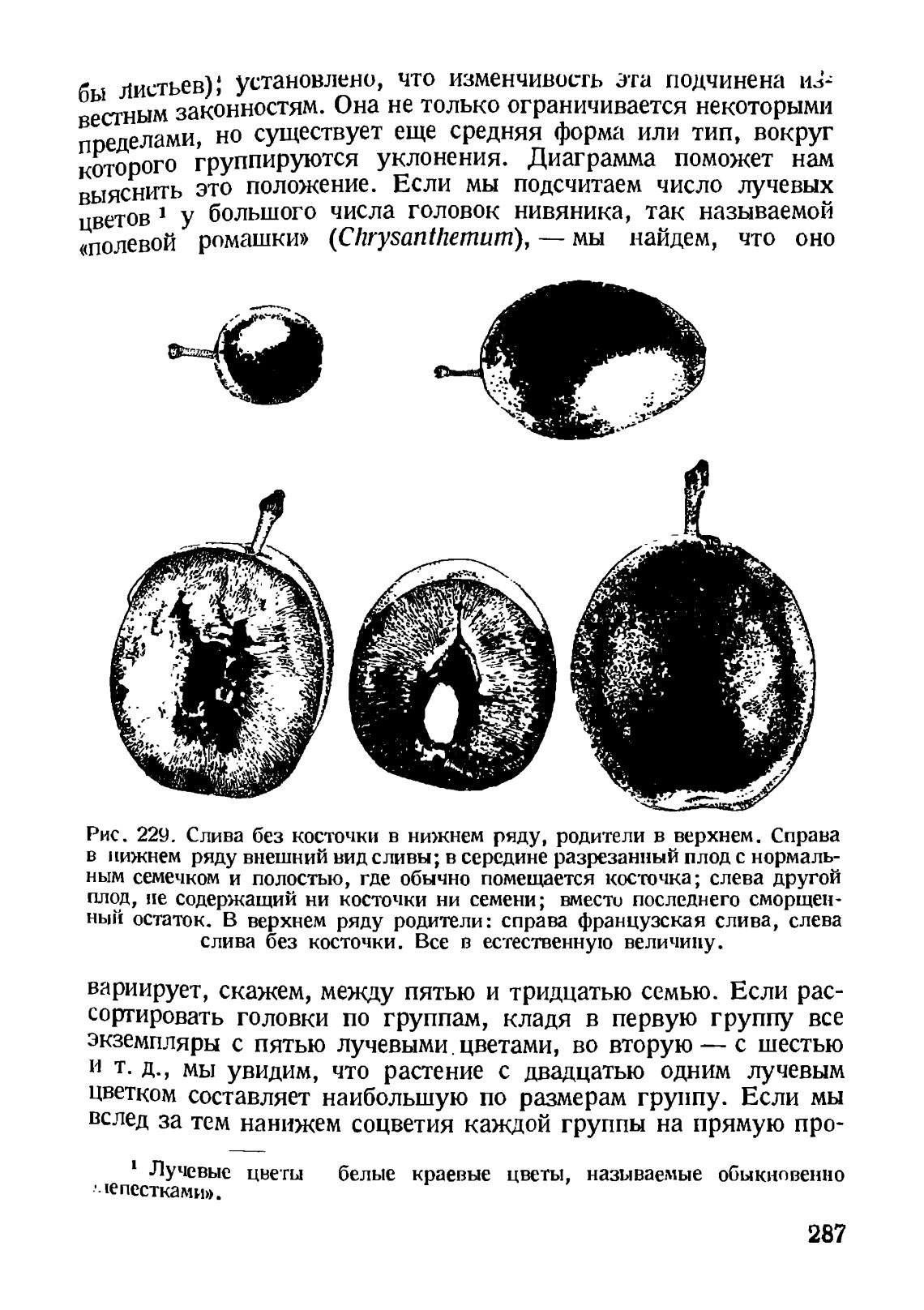 Рис. 229. Слива без косточки в нижнем ряду, родители в верхнем. Справа