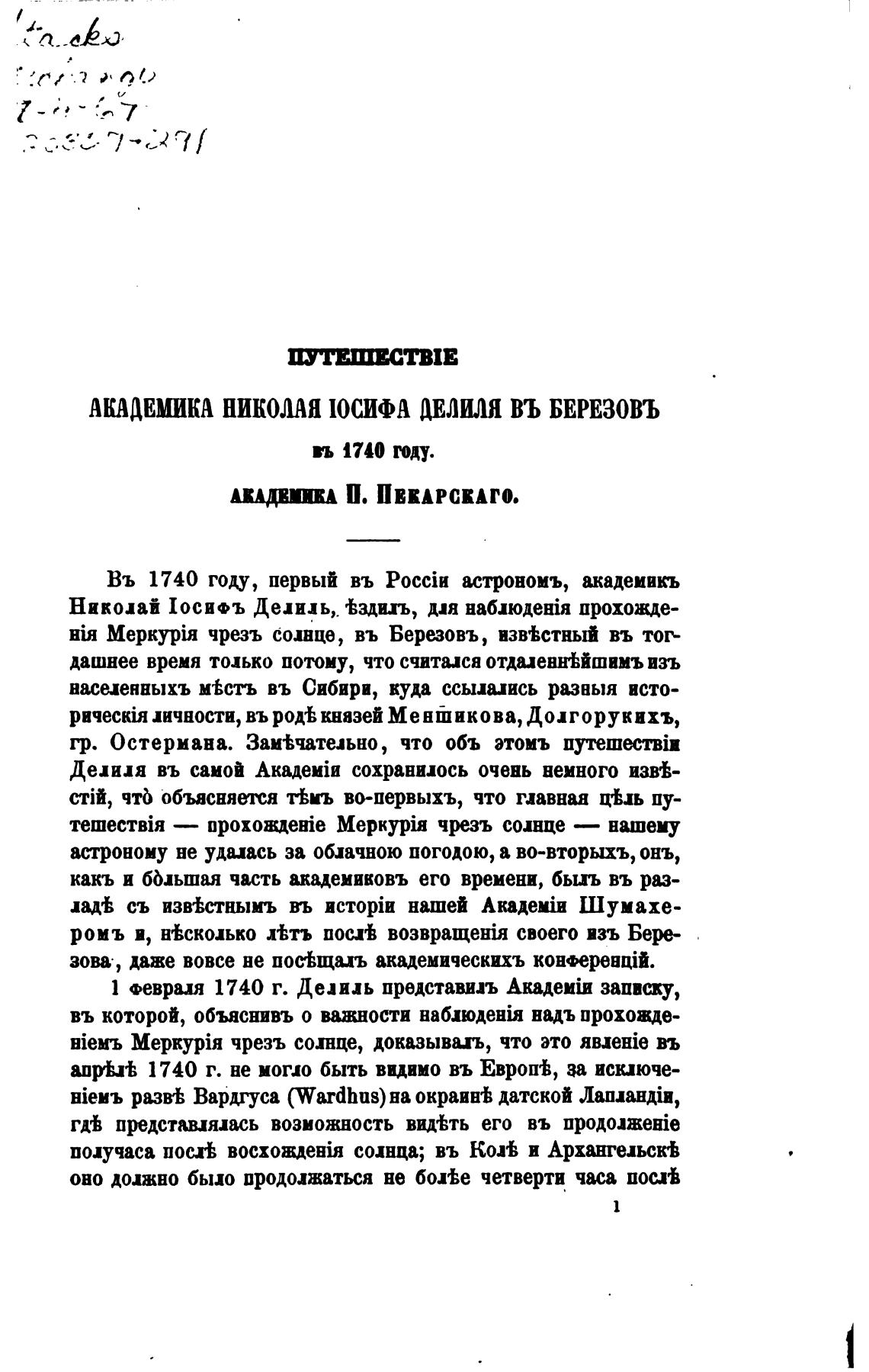 АКАДЕМИКА НИКОЛАЯ ЮСИФА ДЕЛИЛЯ ВЪ БЕРЕЗОВЪ