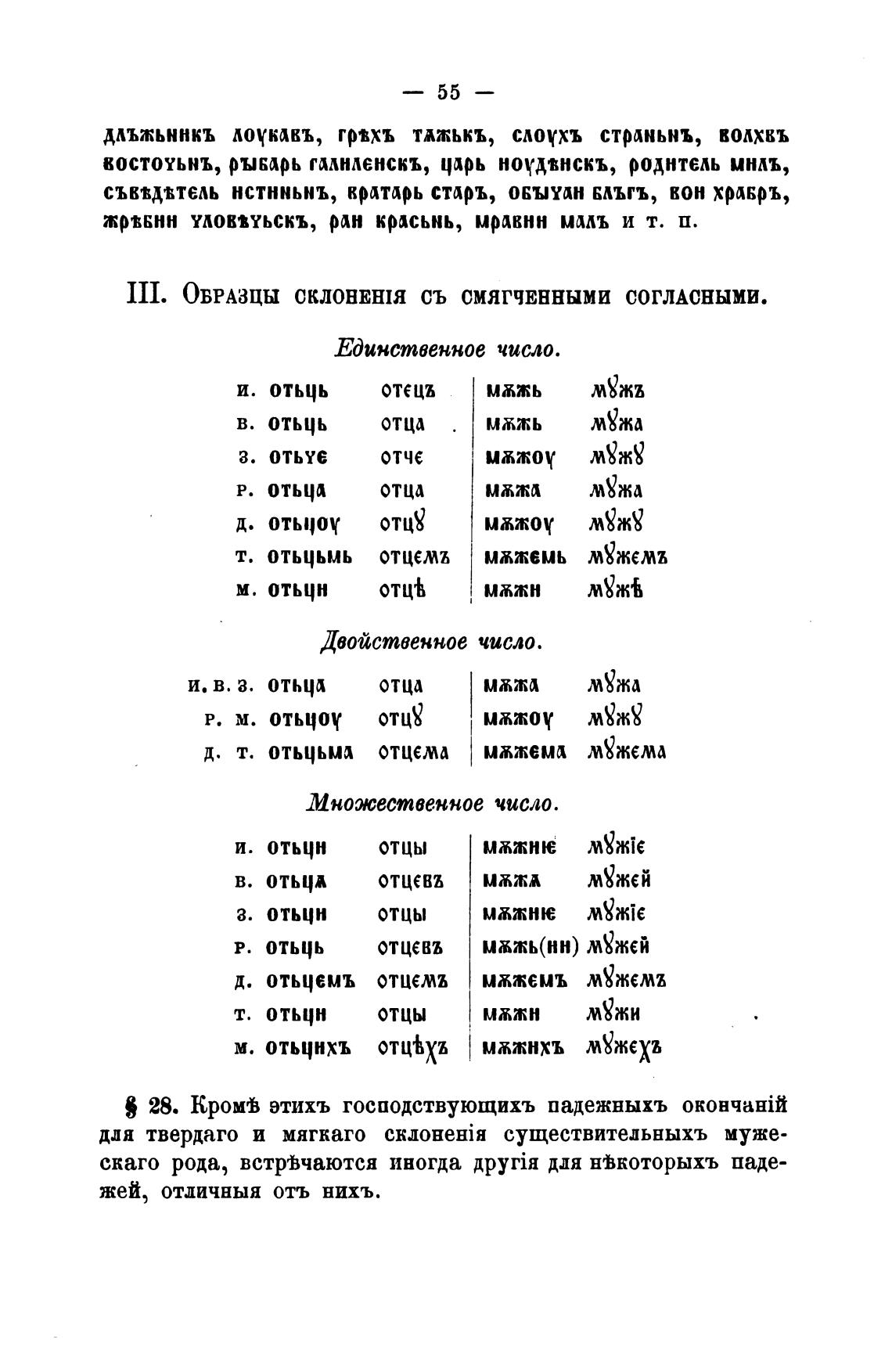 III. ОБРАЗЦЫ СКЛОНЕНИЯ СЪ СМЯГЧЕННЫМИ СОГЛАСНЫМИ.