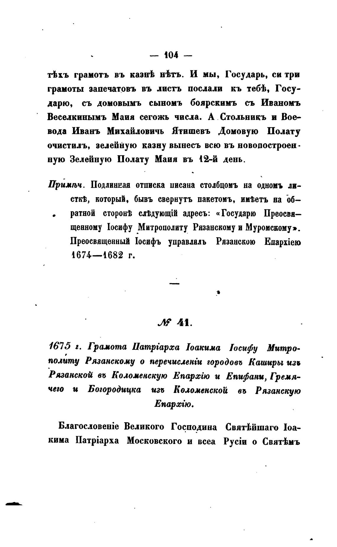 щенному 1оеифу Митрополиту Рязанскому и Муромскому».