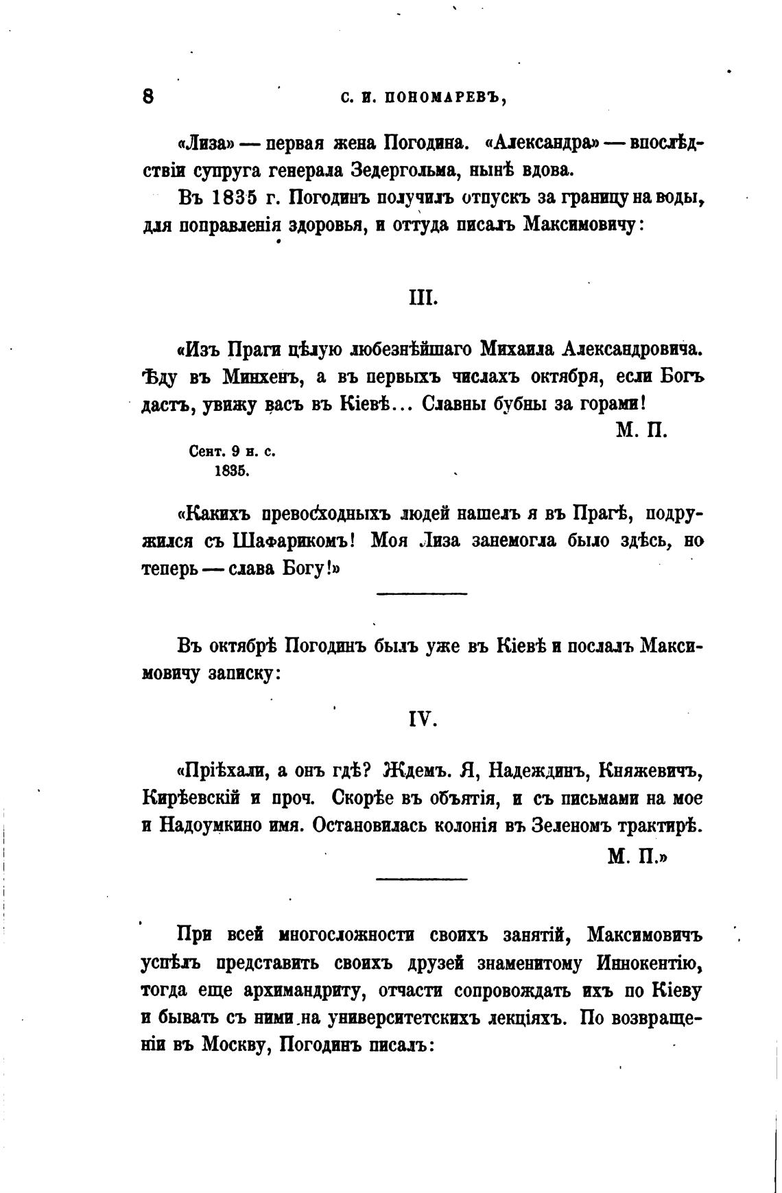Въ 1835 г. Погодинъ получить отпускъ за гранипу на воды,