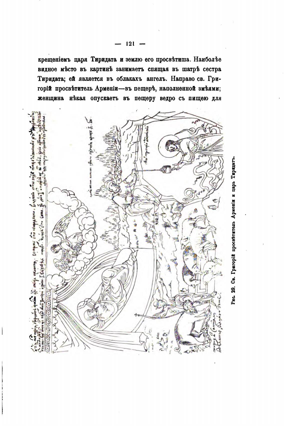 Тиридата; ей является въ облакахъ ангедъ. Направо св. Гри-