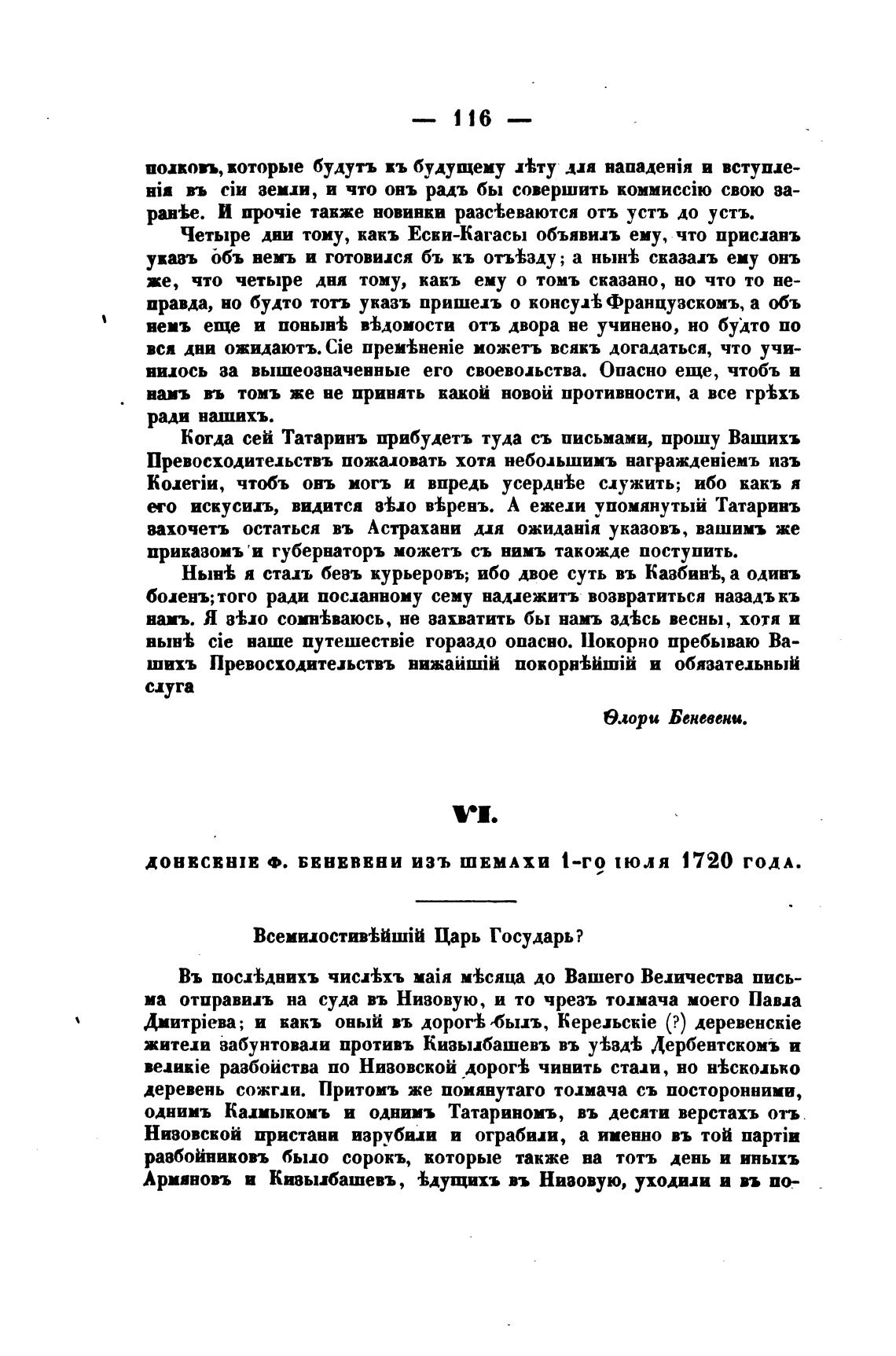 ДОНЕСЕНИЕ Ф. Бвнвввни ИЗЪ ШЕМАХИ 1-Г9 ПОЛЯ 1720 ГОДА.