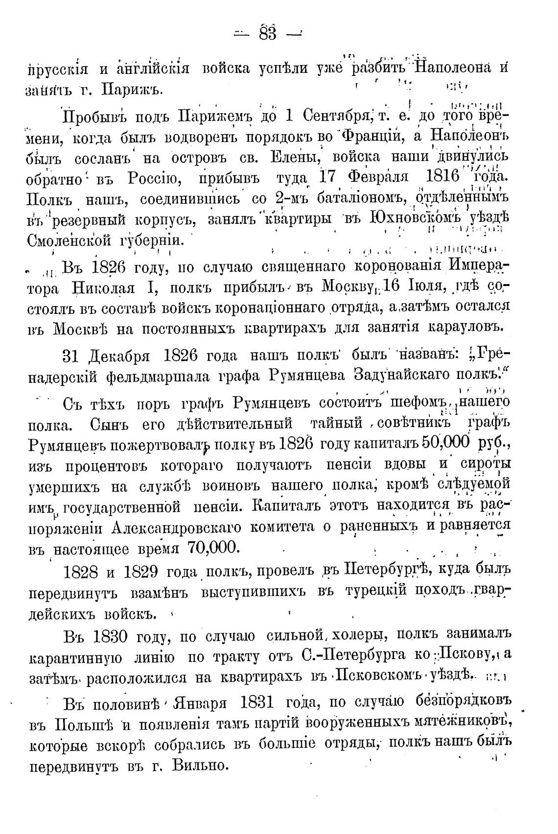 Румянцець пожертвовалгу полку въ 1826 году капиталь 50,(ЮО руф.,