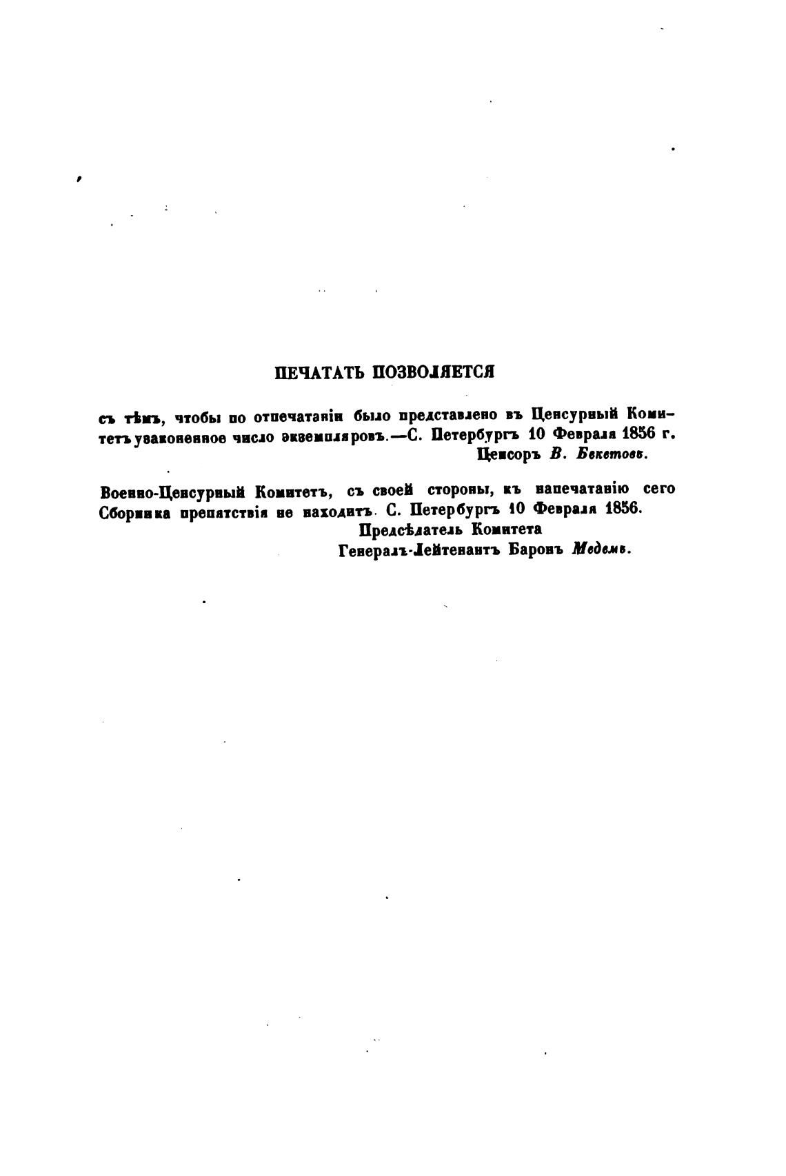 Сборивка ве ваходитъ. С. Петербургъ 10 Февраля 1856.