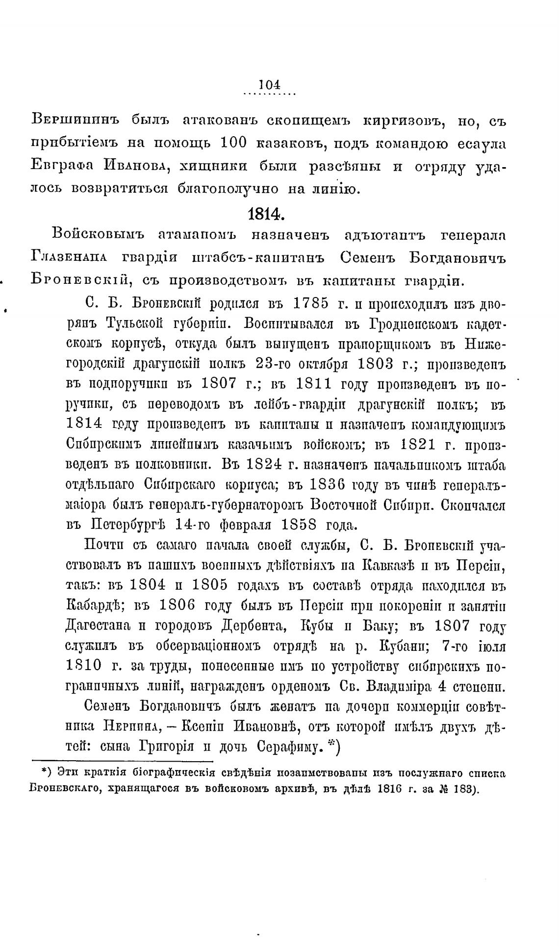 БРОНЕВСКАГО, хранящагося въ войсковомъ архивв, въ 1816 г. за 183).