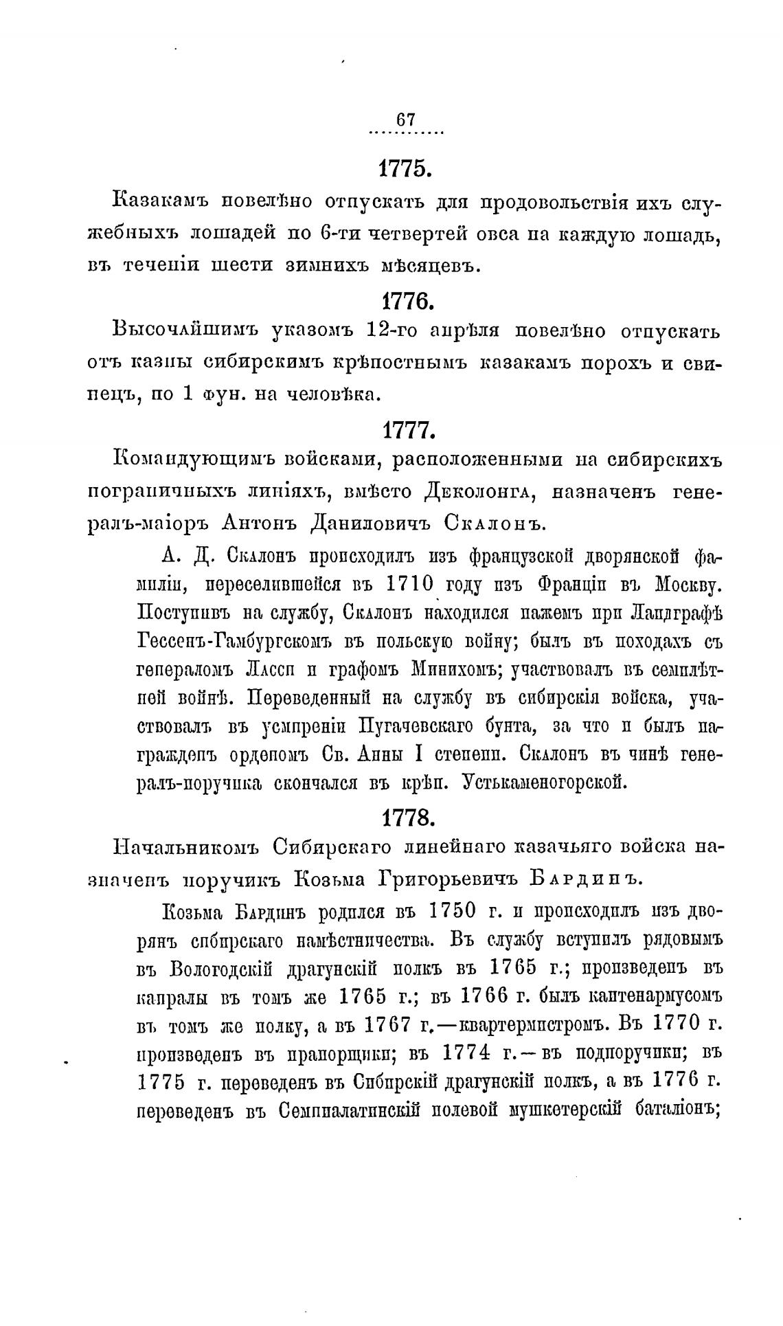 1775 г. переведень въ Сибирс1йй драгунстйй полкъ, въ 1776 г.