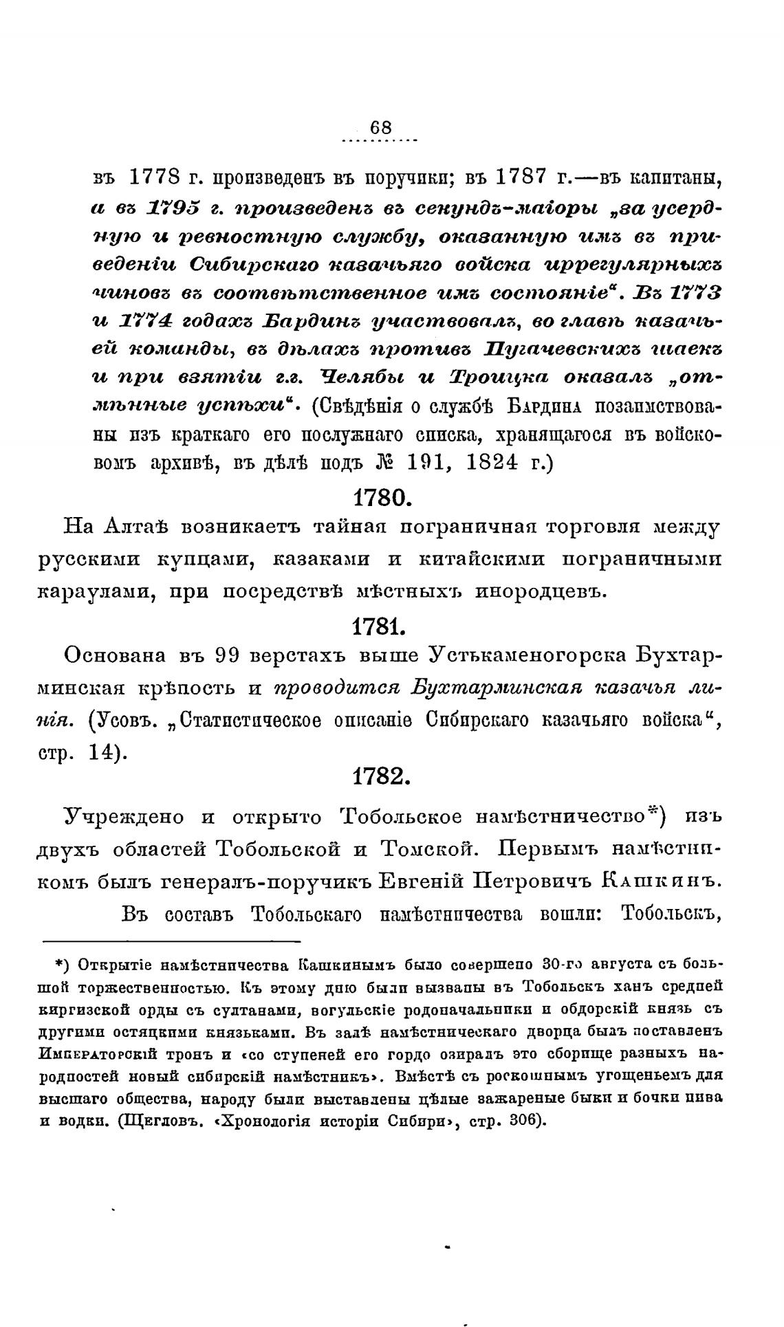 въ 1778 г. произведень въ поручики; въ 1787 г.——въ капитаны,