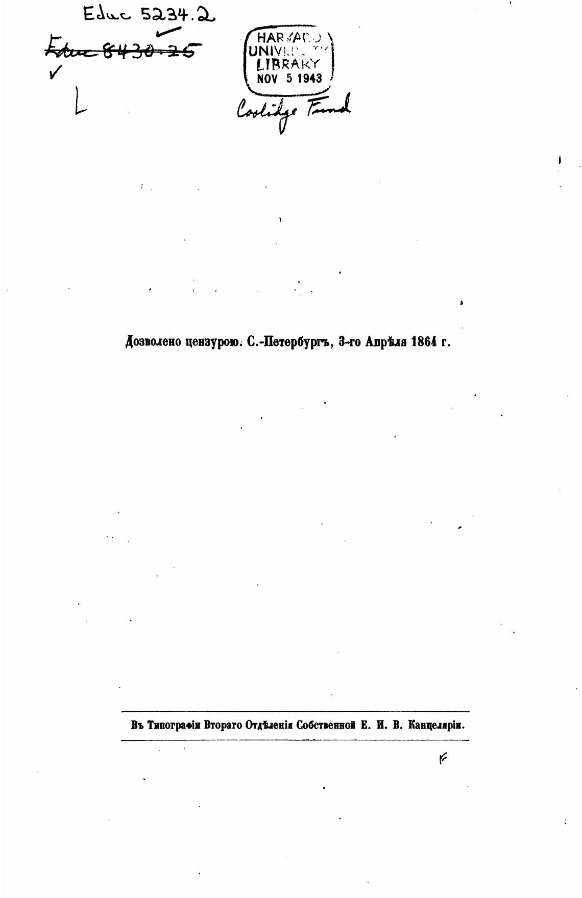 Дозолено цензурою. С.-Петербуррь, 3-го Апрья 186' г.