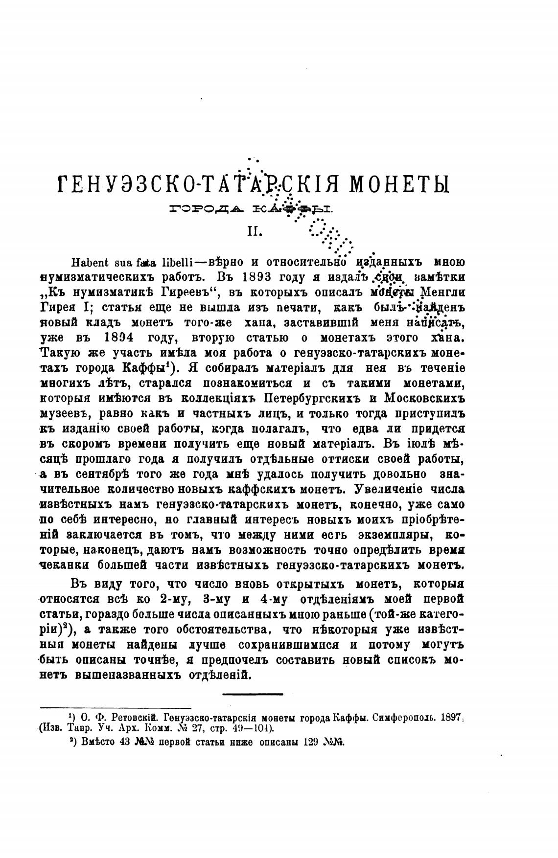 1) О. Ф. Ретовск(й. монеты города Каффы. Симферополь. 1897.