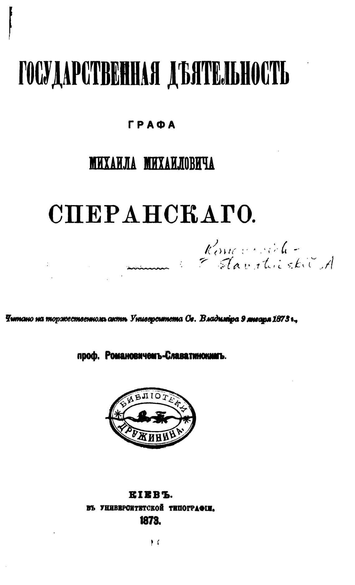 Государственная деятельность графа Михаила Михаиловича Сперанского. - Романович-Славатинский А. В.