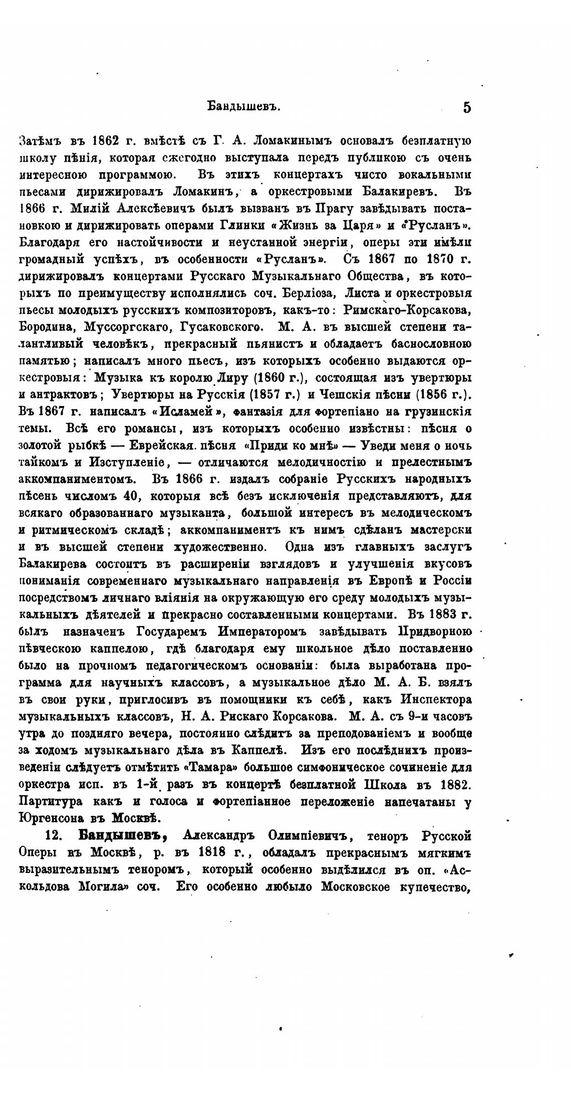 пьесами дирижировалъ Ломакинъ, а оркестровыми Балакиревъ. Въ
