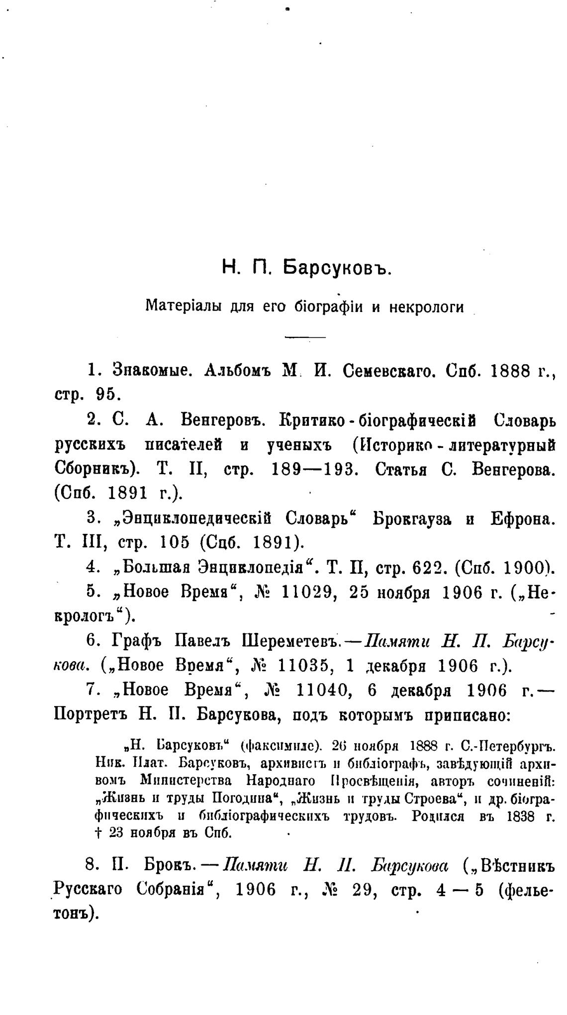 8. П. Бровь. — Памяти Н. И. Барсукова В%стникъ
