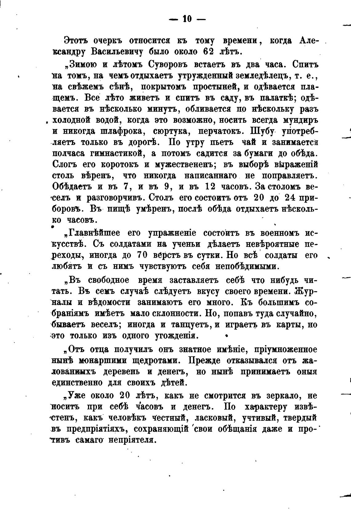 „Зимою и гвтомъ Суворовъ встаетъ въ два часа. Спить