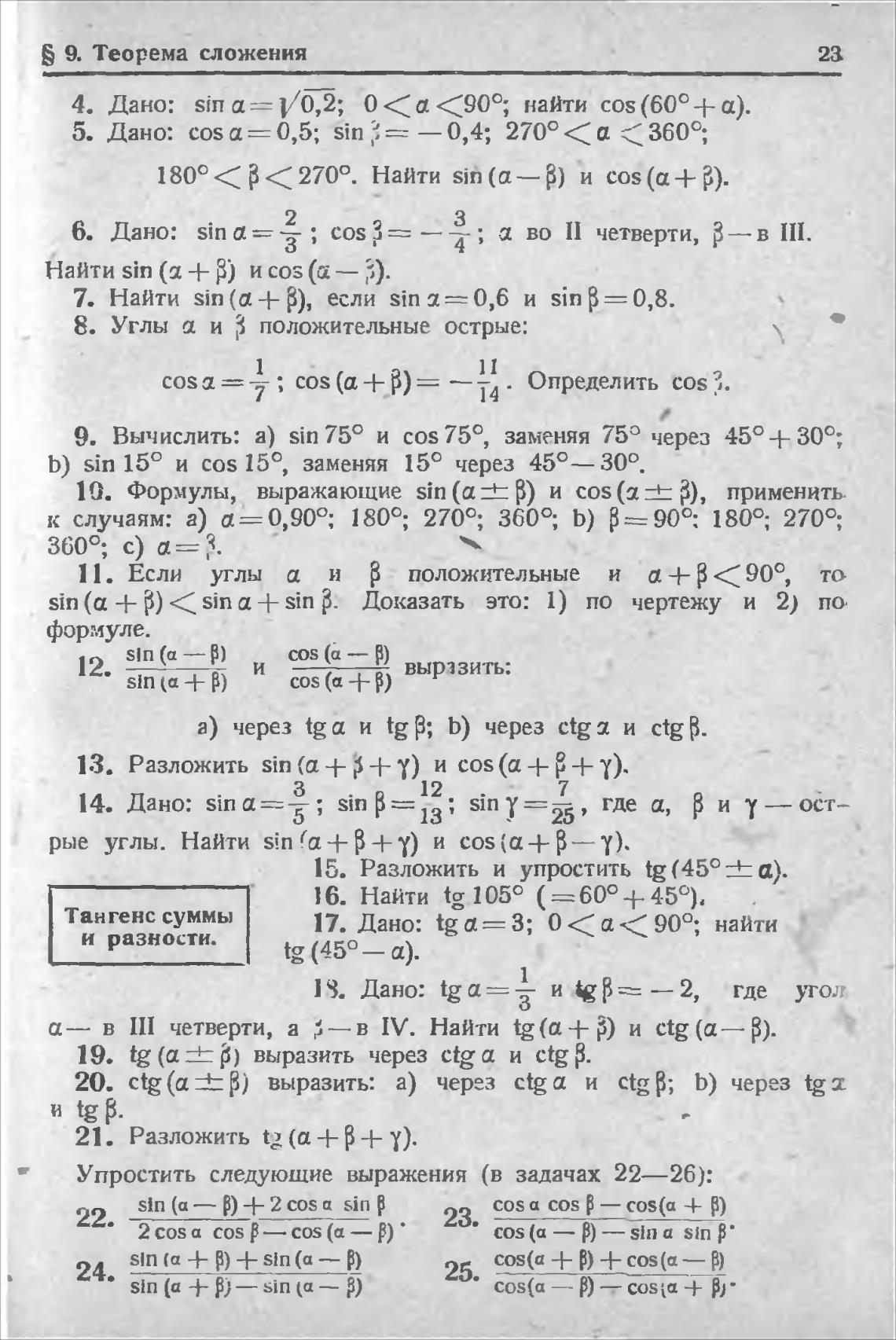 20. ctg (а выразить: а) через ctga и Ctg р; Ь) через tgz