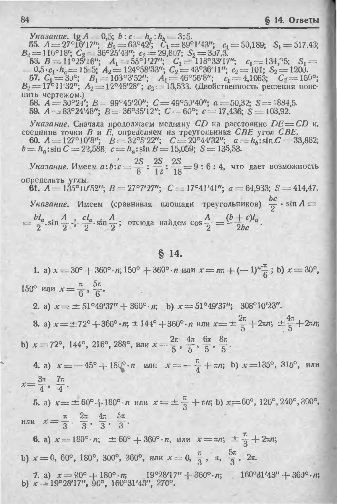 59. А =8ЗО24'ђ8”• В=36035'12”• С=600•, 17,436; S = 103,92.