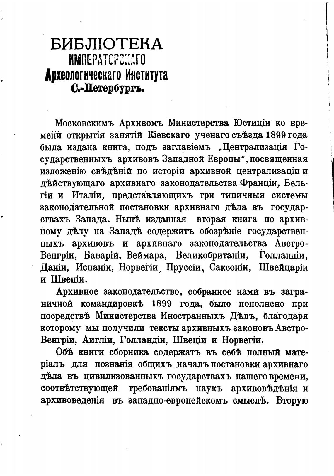 сударственныхъ архивовъ Западной Европы", посвященная