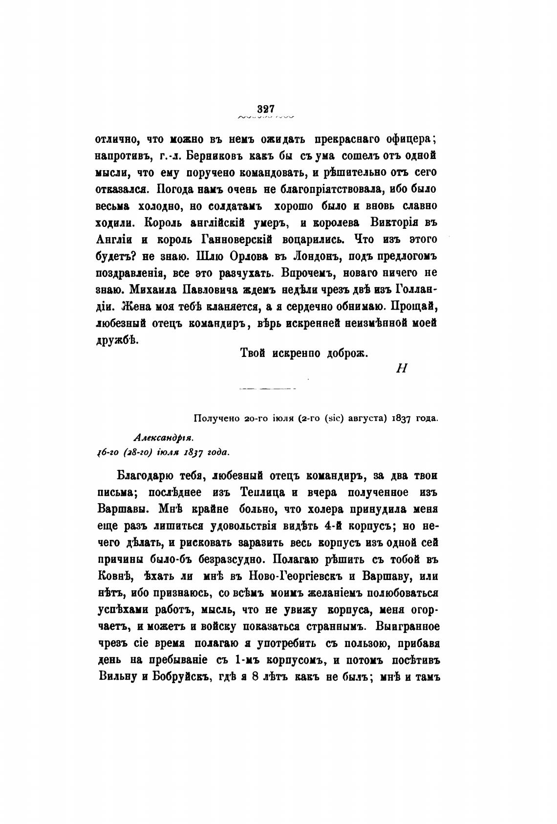 Получено 20-го (2-го (sic) августа) 1837 года.