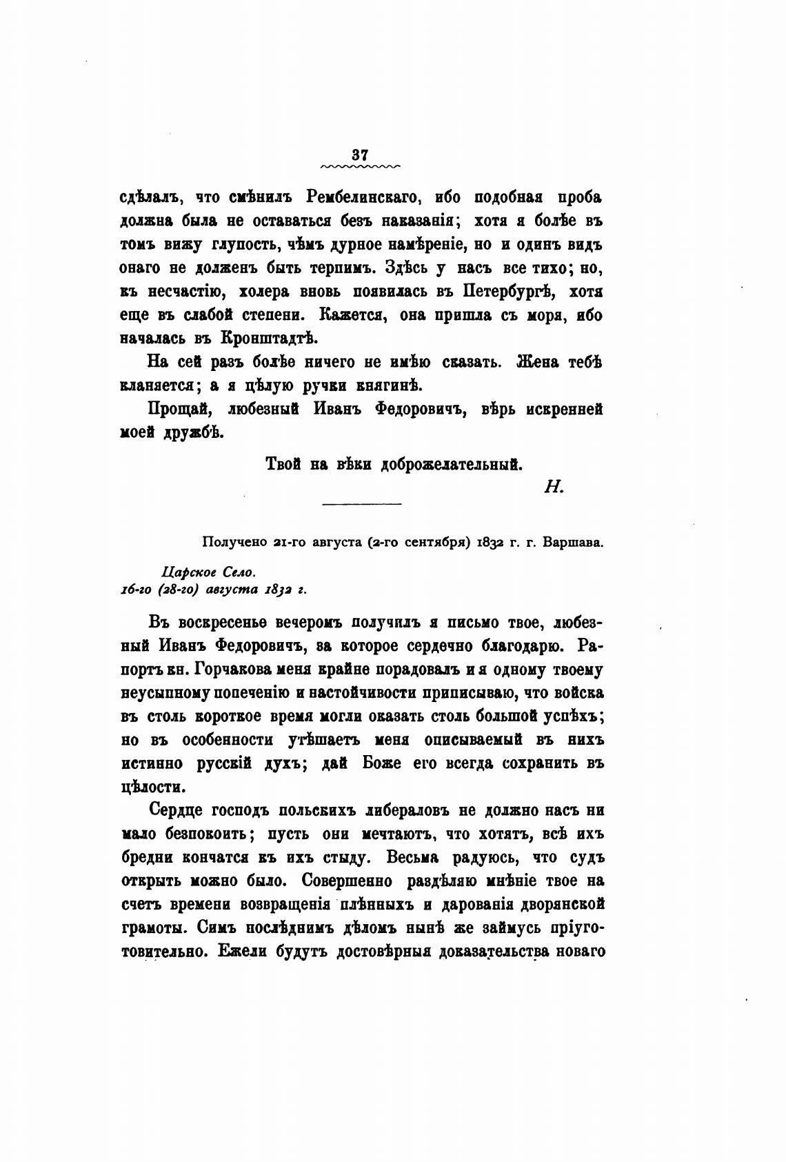 Получено 21-го августа (2-го сентября) 1832 г. г. Варшава.