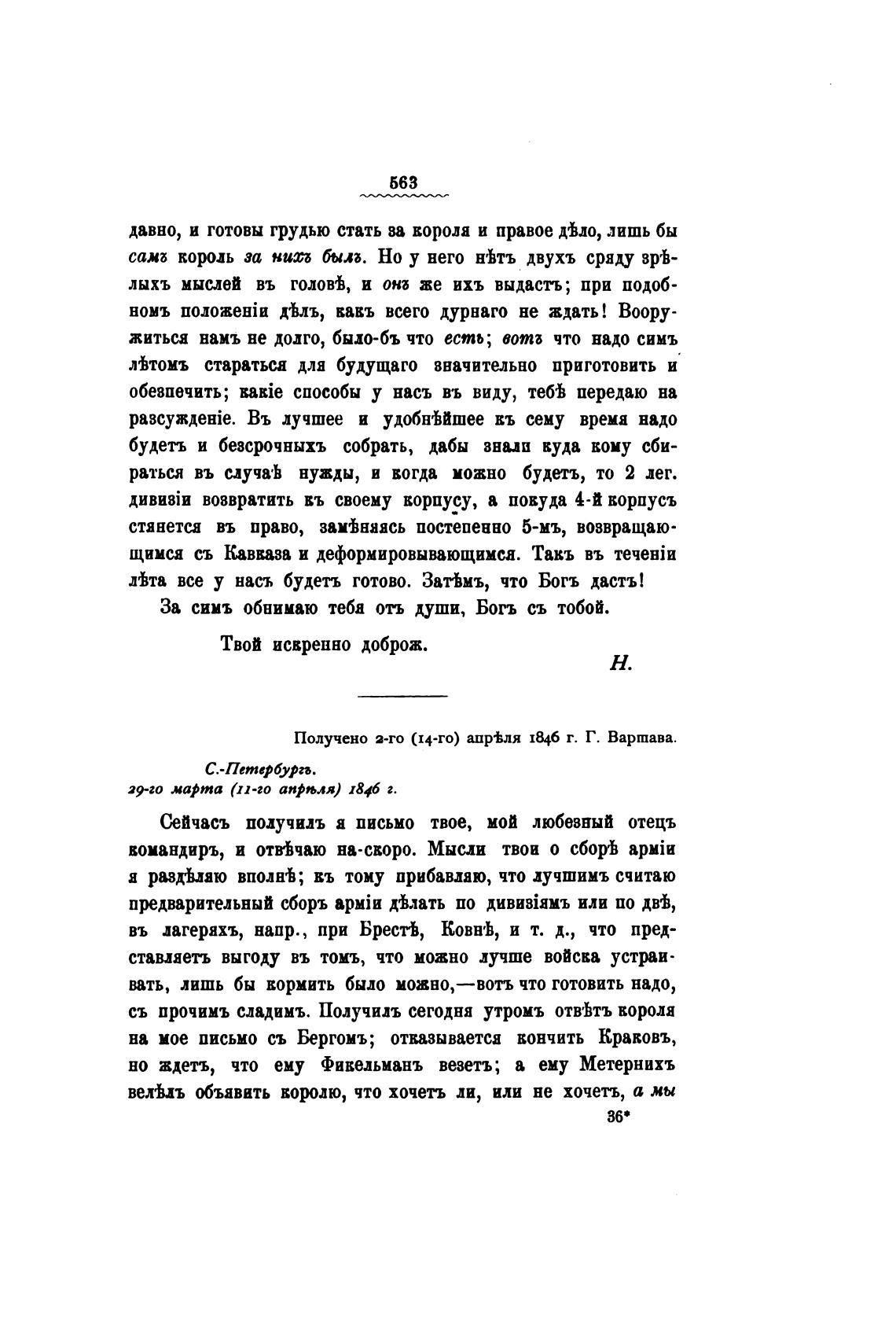 Получено 3-го (14-го) апр%ля 1846 г. Г. Варшава.