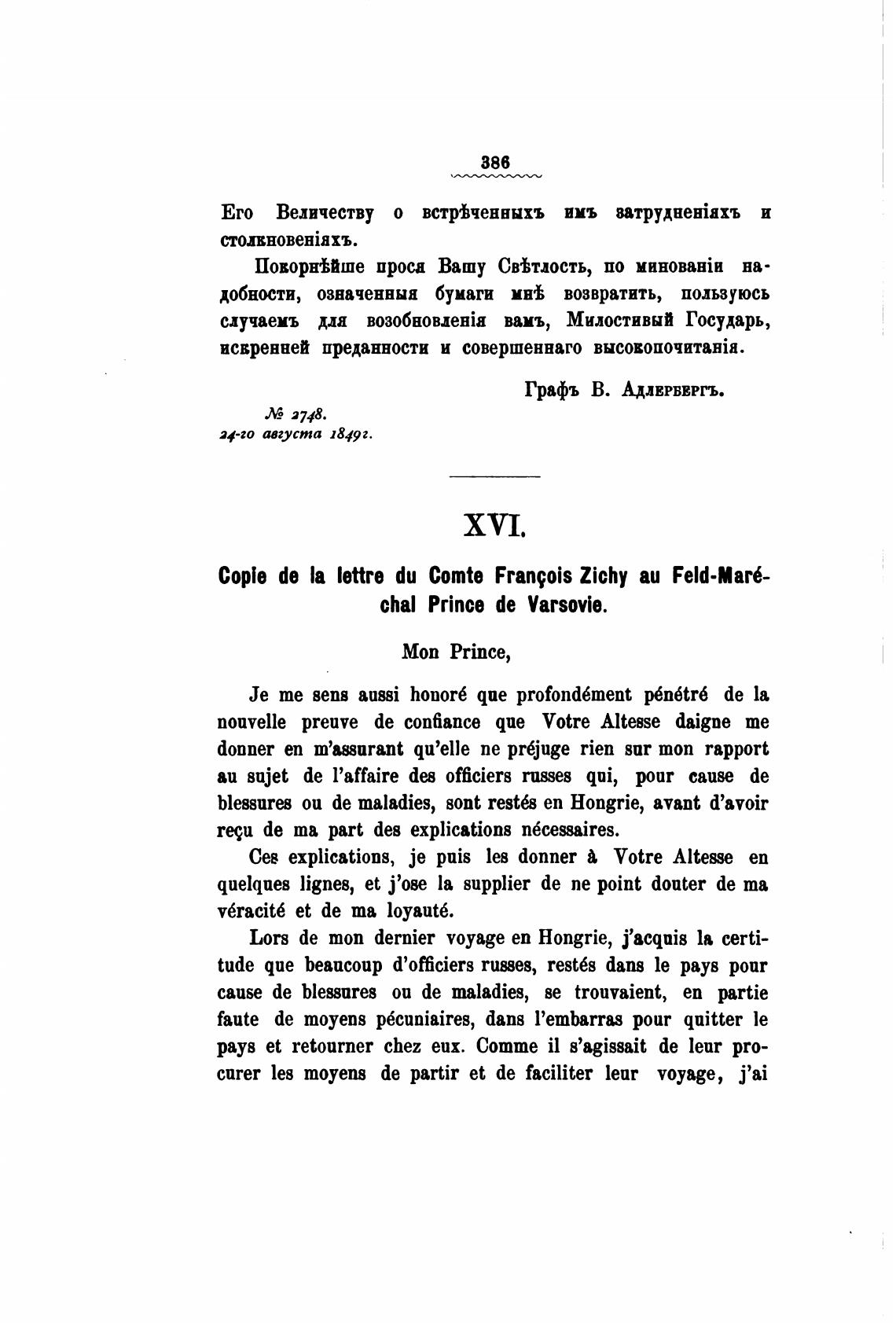 Сорте de Ia lettre du Comte Franpis Zichy аи Feld-Mar6-