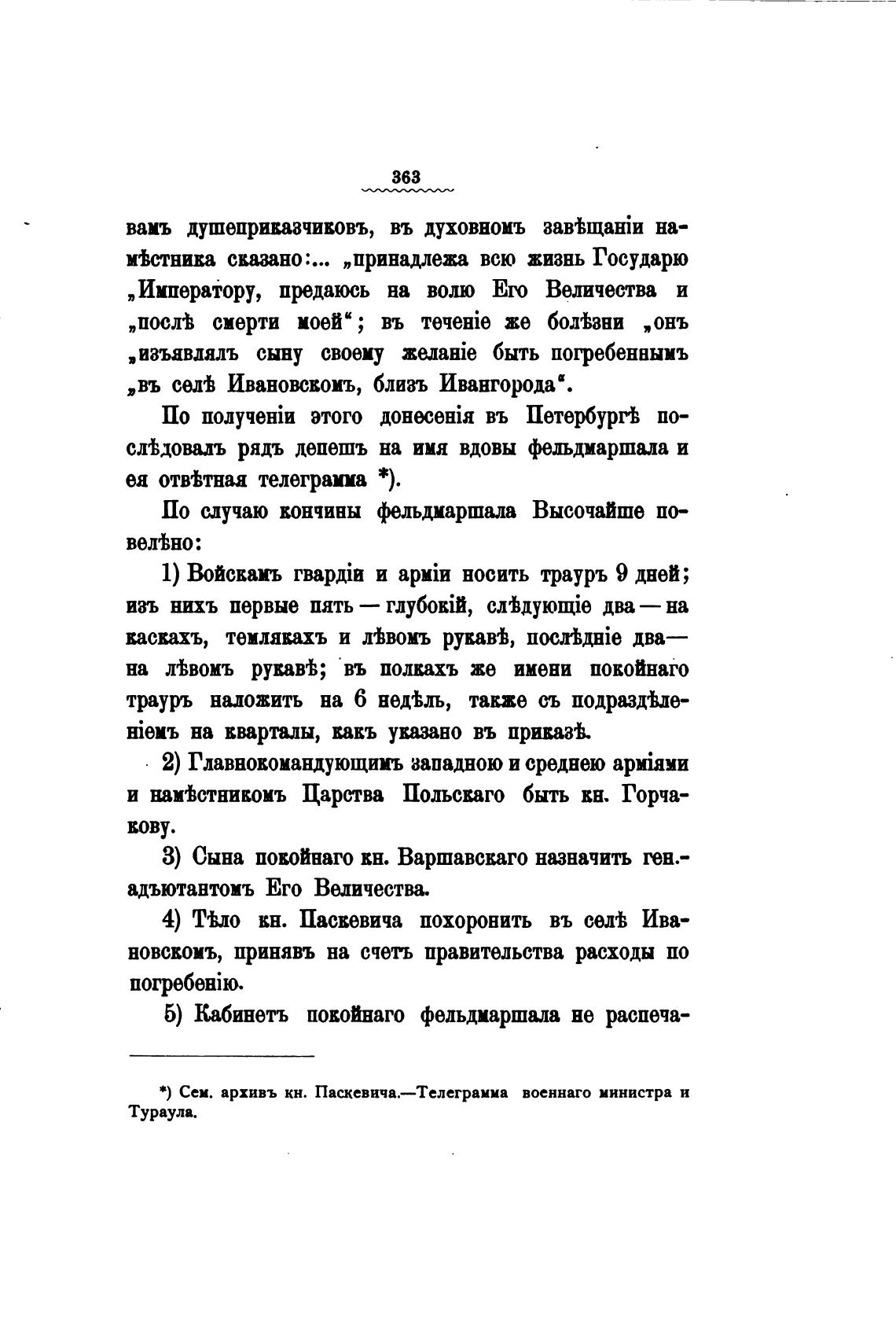 *) Сем. архивъ кн. Паскевича.—Телеграмма военнаго министра и