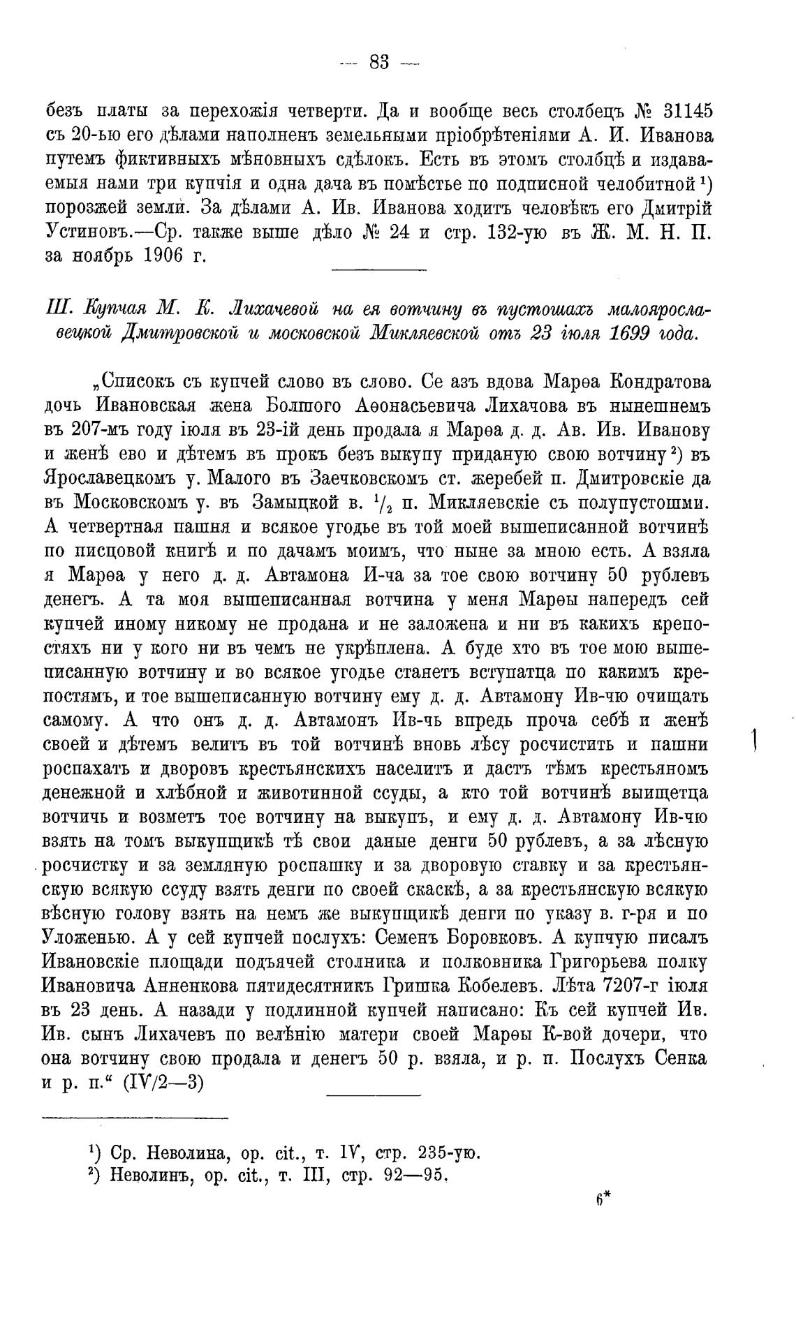 Ш. Купчая М. К. Литачевой на и вотчину пустошап малояросло-
