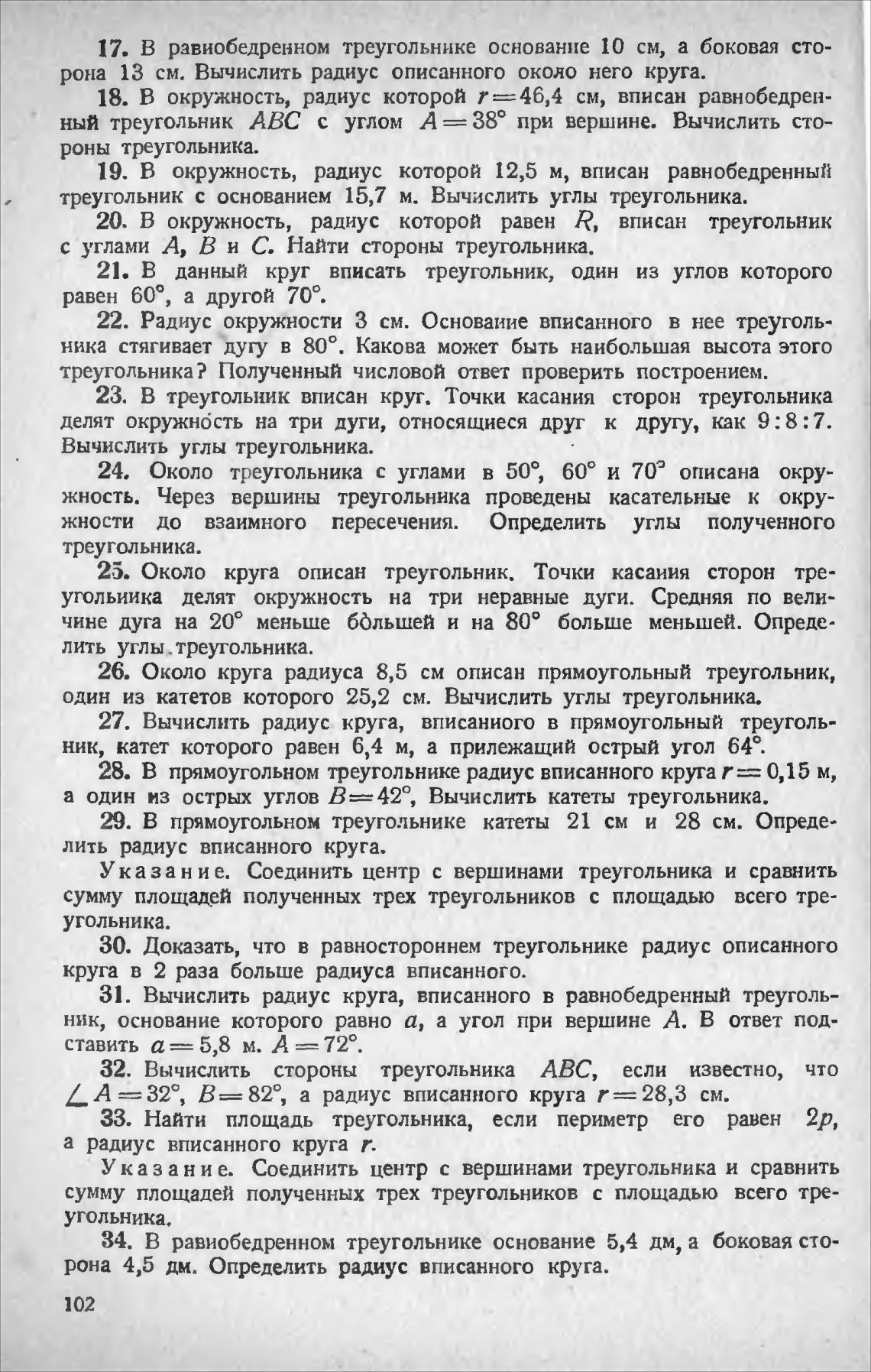 27. Вычислить радиус. круга, вписаниого в прямоугольный треуголь-