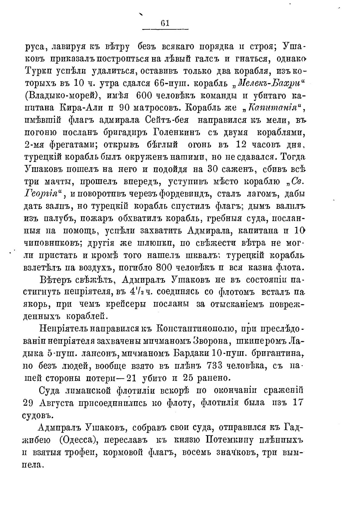 Ушаковъ пошелъ на него и подойдя на 30 сажень, сбивъ