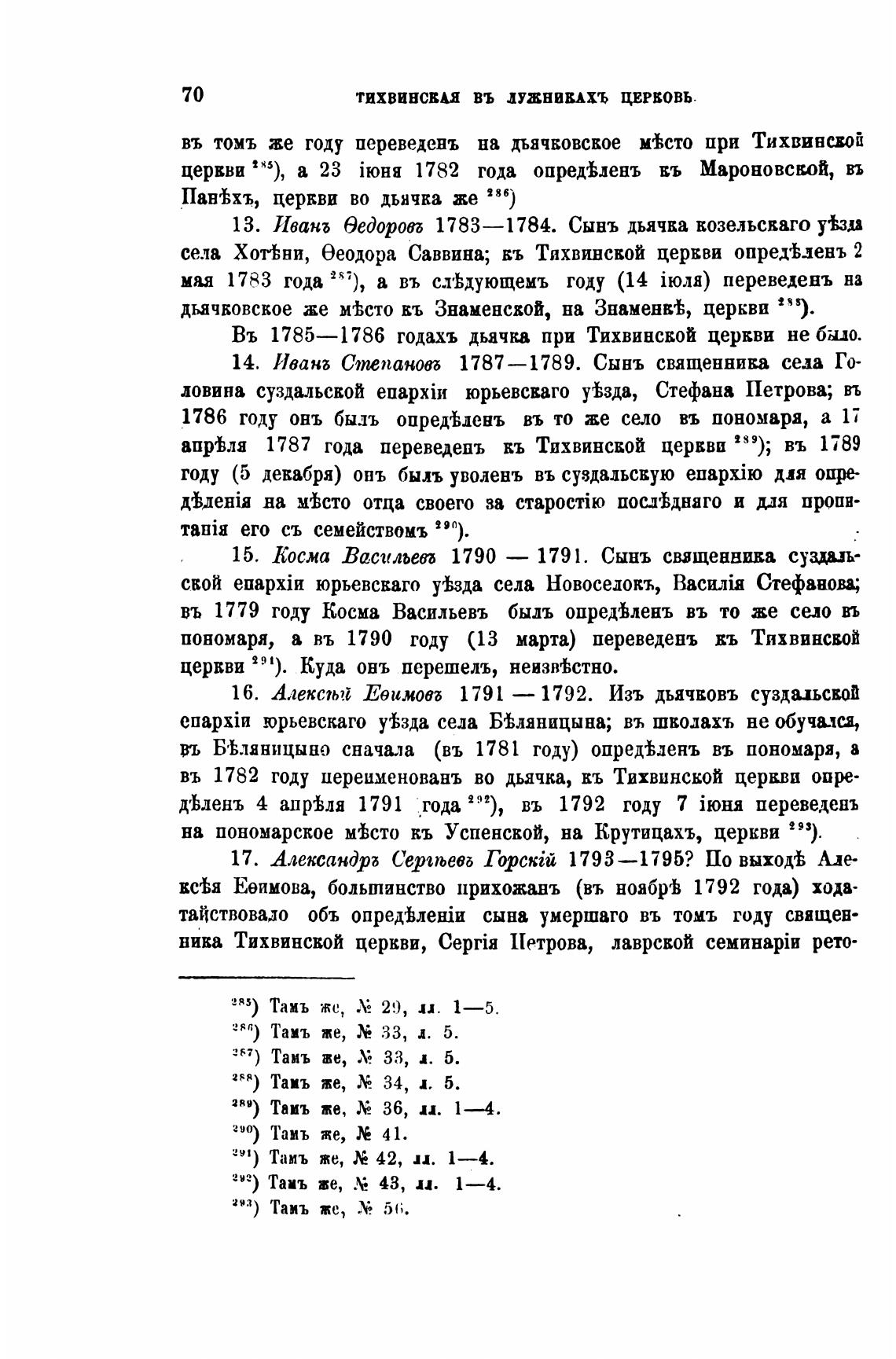 Въ 1785—1786 годахъ дьячка при Тихвинской церкви не было.