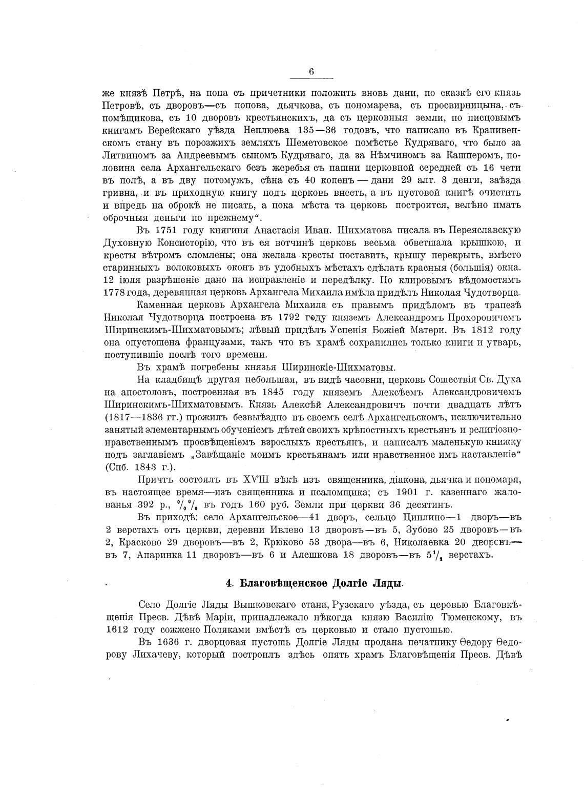 Въ прихохЬ: село Архангельское—41 дворъ, сельцо Циплино—1 дворъ—въ