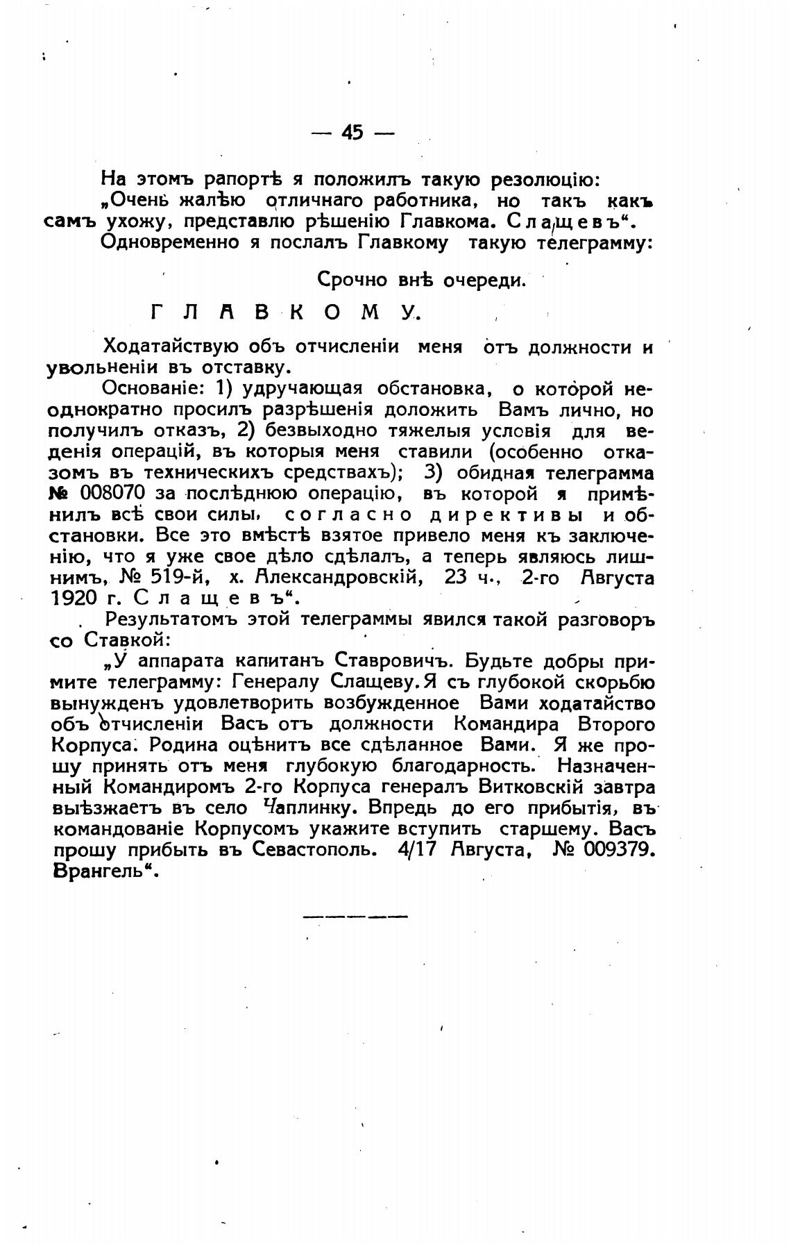 мите телеграмму: Генералу Слащеву.Я съ глубокой скорьбю