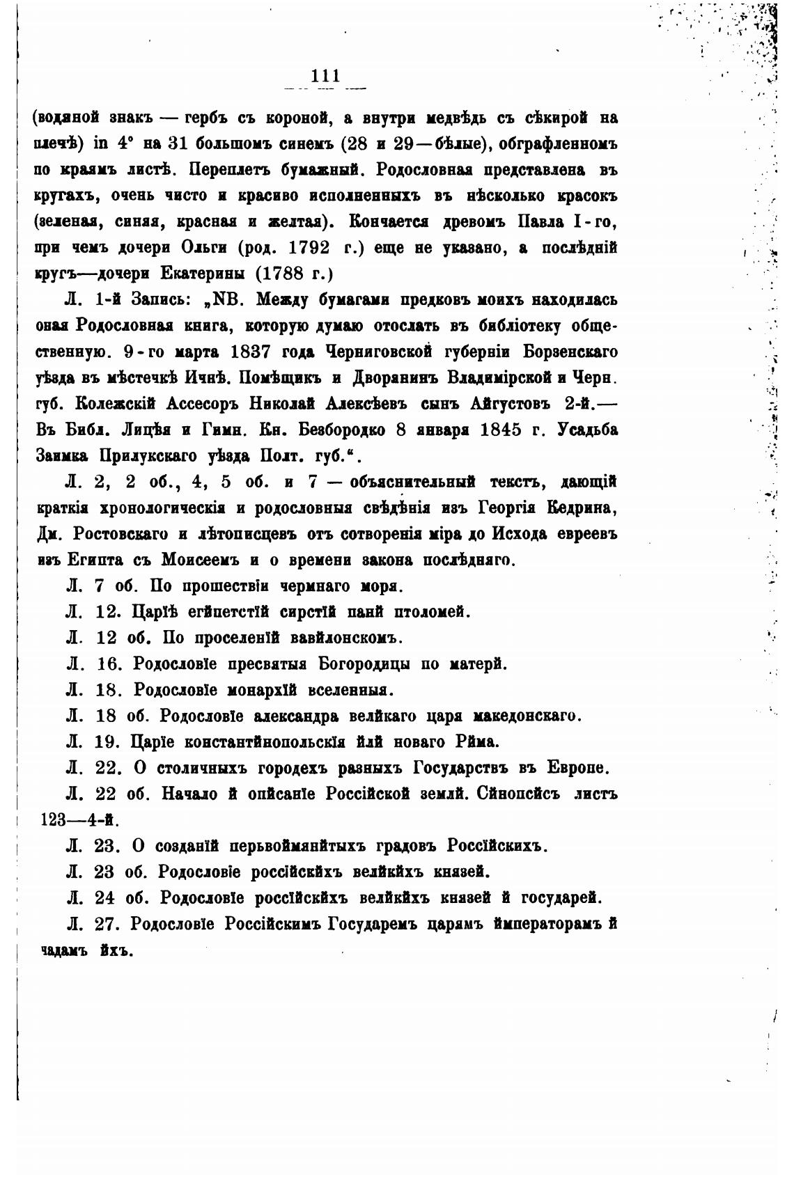 Л. 1-й Запись: „NB. Между бумагами предковъ моихъ находилась