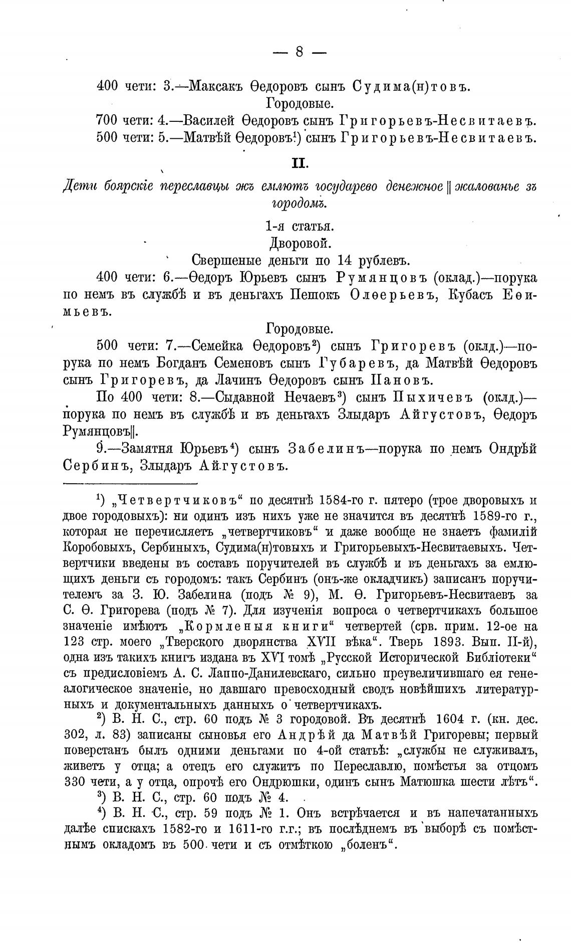 1) , Четвертчиковъ” по десятнгђ 1584-го г. пятеро (трое дворовыхъ и