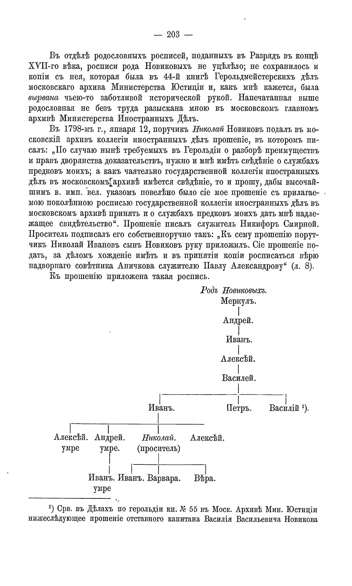 Въ 1798-мъ г., лпваря 12, поручикъ Николай Новиковъ подаль въ мо-