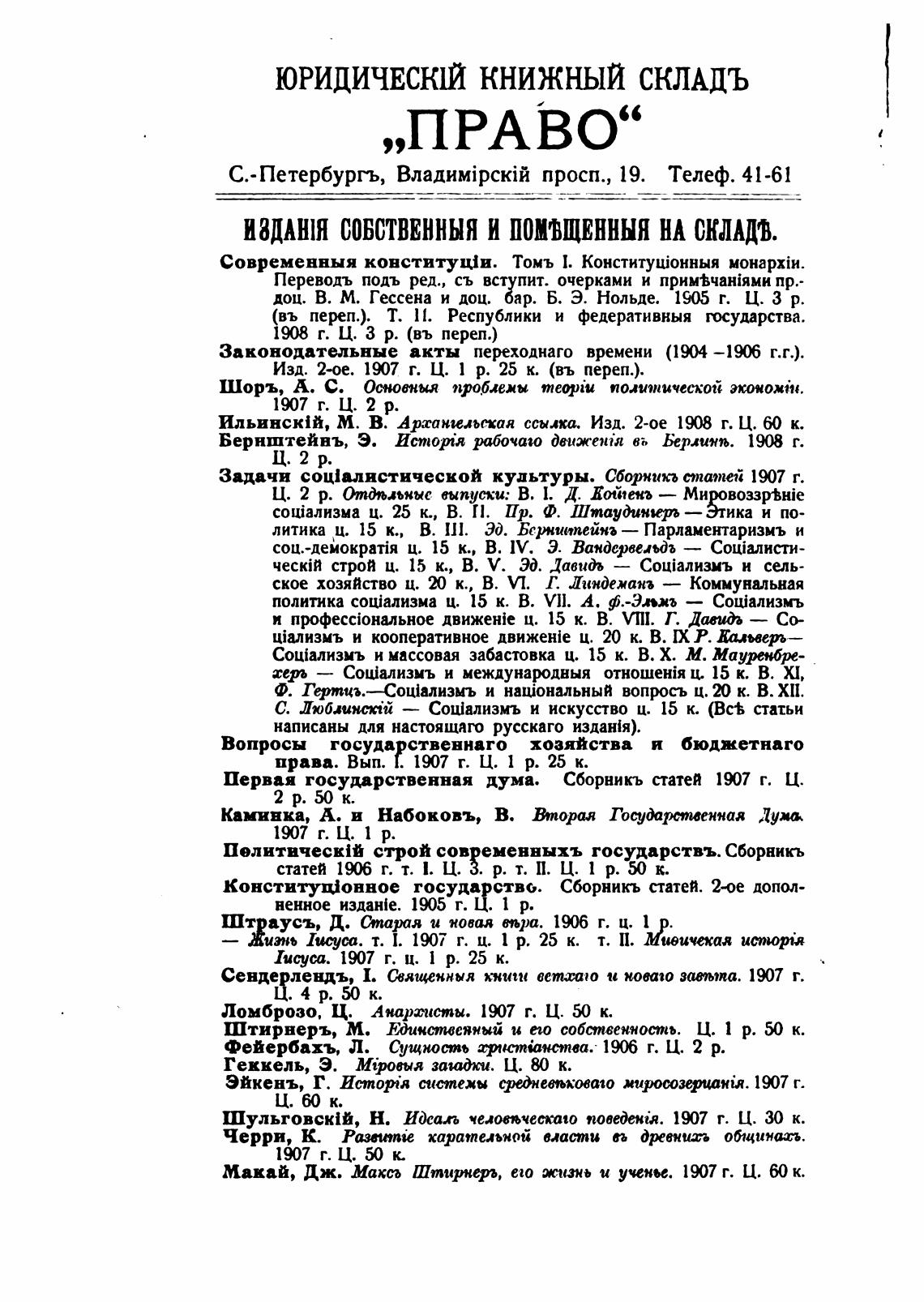 С.- Петербургь, просп., 19. Телеф. 41-61