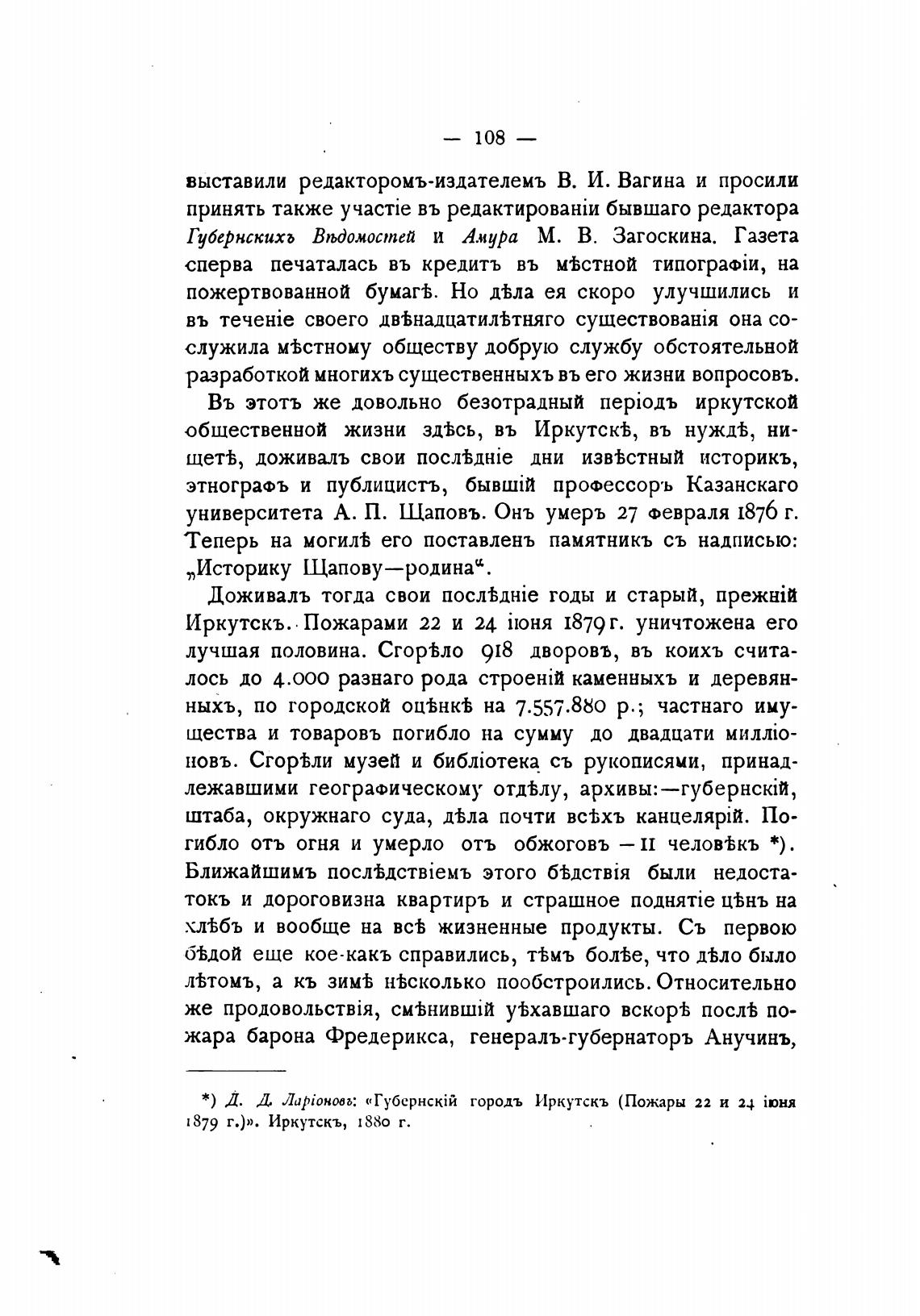 Иркутскъ.. Пожарами 22 и 24 1879 г. уничтожена его