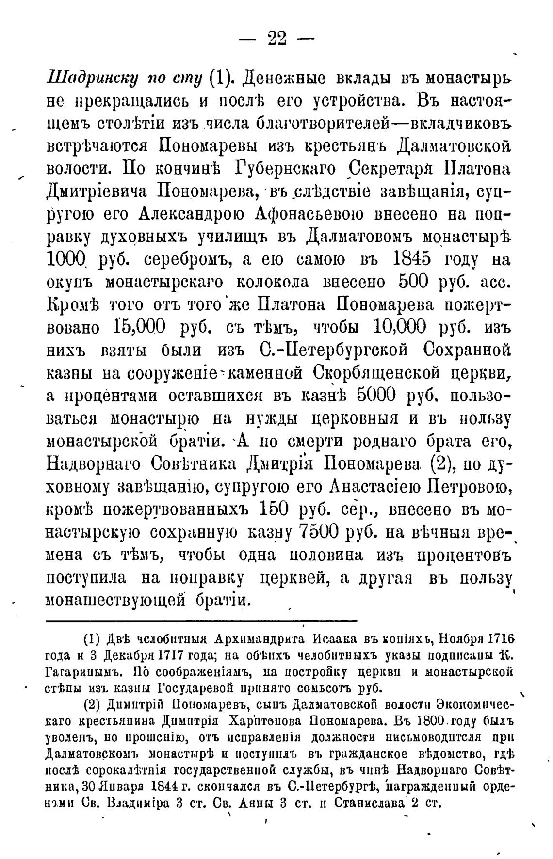 Шадринску по сту (1). Денежные вклады въ монастырь