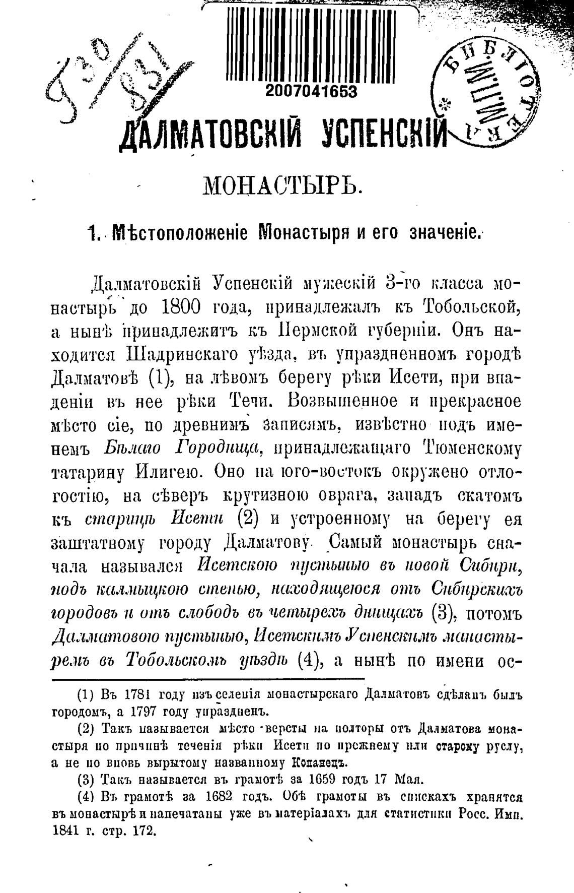 (1) Въ 1781 году изъ ce„1euiil монастырскаго Далматовъ схЬлапъ быль