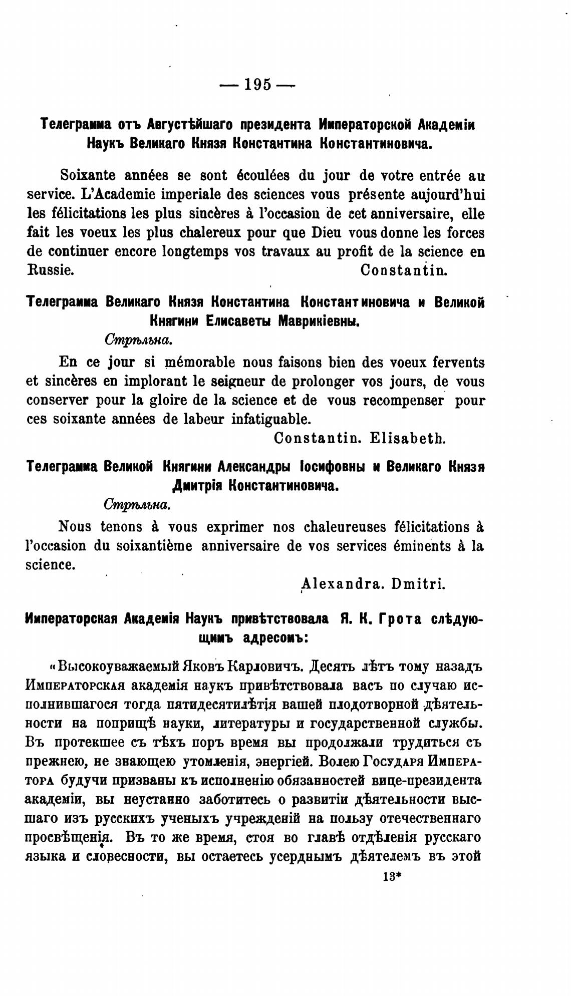 Императорская Наукъ прив%тствовала Я. К. Грота сл%дую-