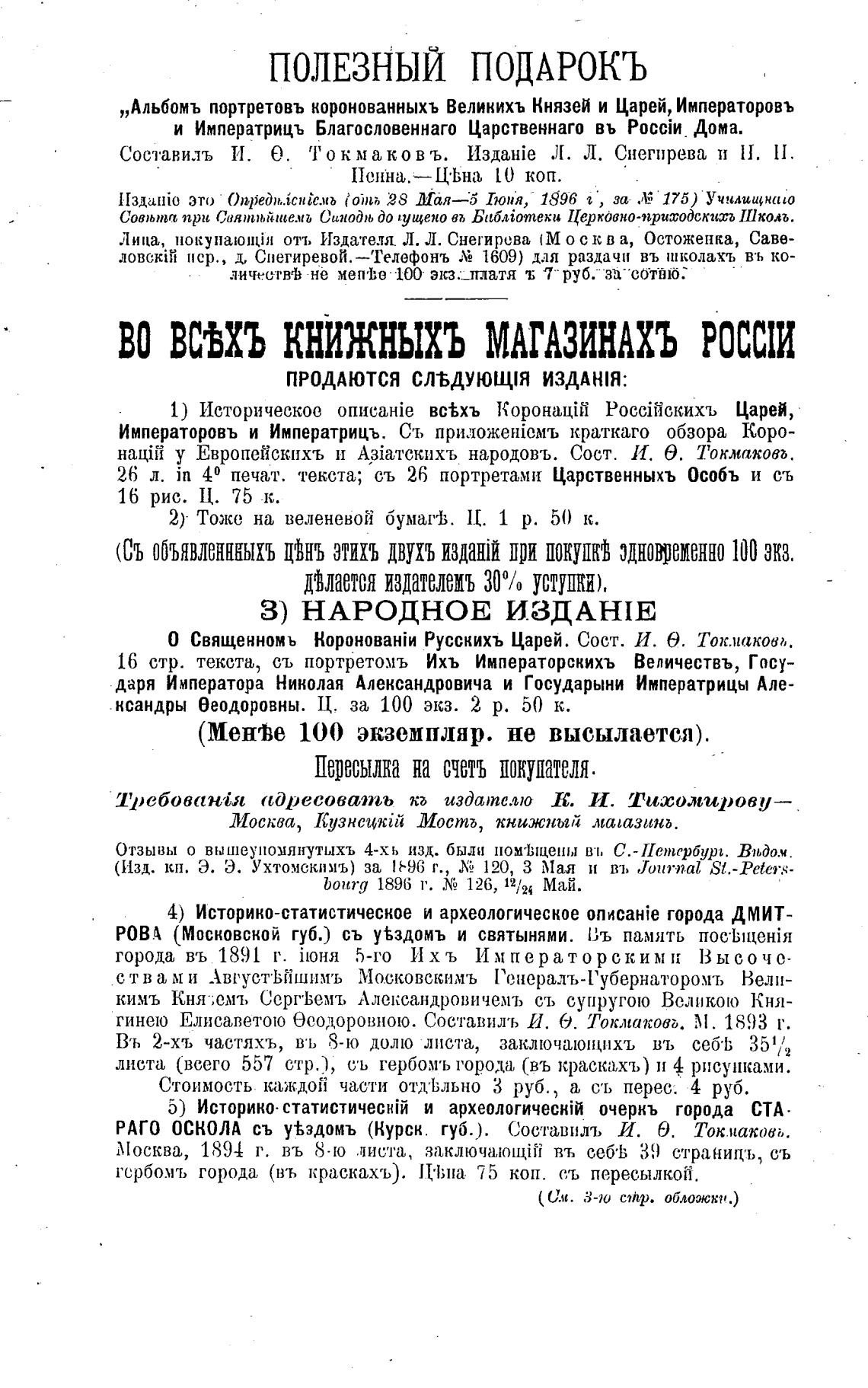(Съ объявленнныхъ цЈнъ этихъ двухъ издашй три покупкЈ одновременно 100 экз.