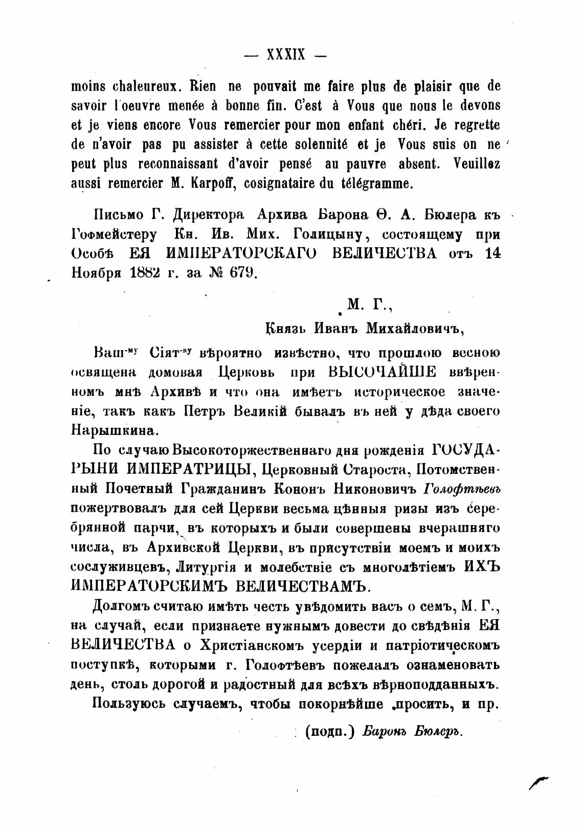 Письмо Г. Директора Архива Барона е. А. Бюлера кь