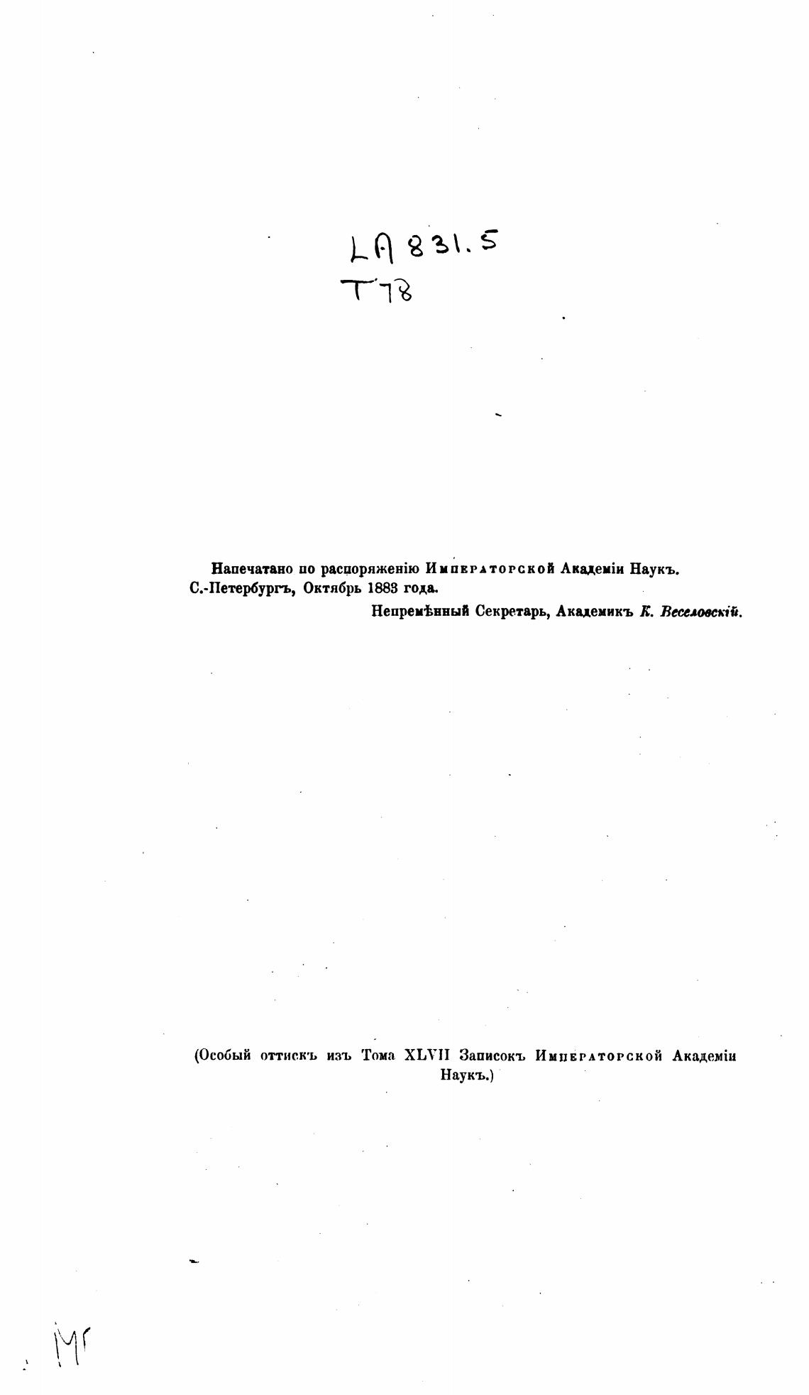 (Особый оттискъ изъ Тома XLVII Записокъ ИМПЕРАТОРСКОЙ