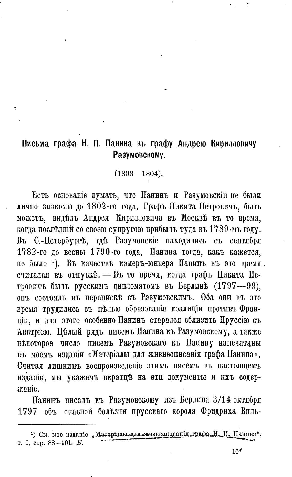 шВкоторое число писемъ Разумовскаго кь Г1аиину напечатаны