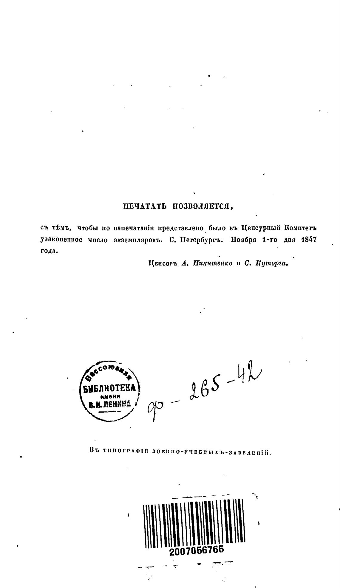 узакопепиое число экземпляровъ. С. Петербургъ. Ноября 1-го дня 1847
