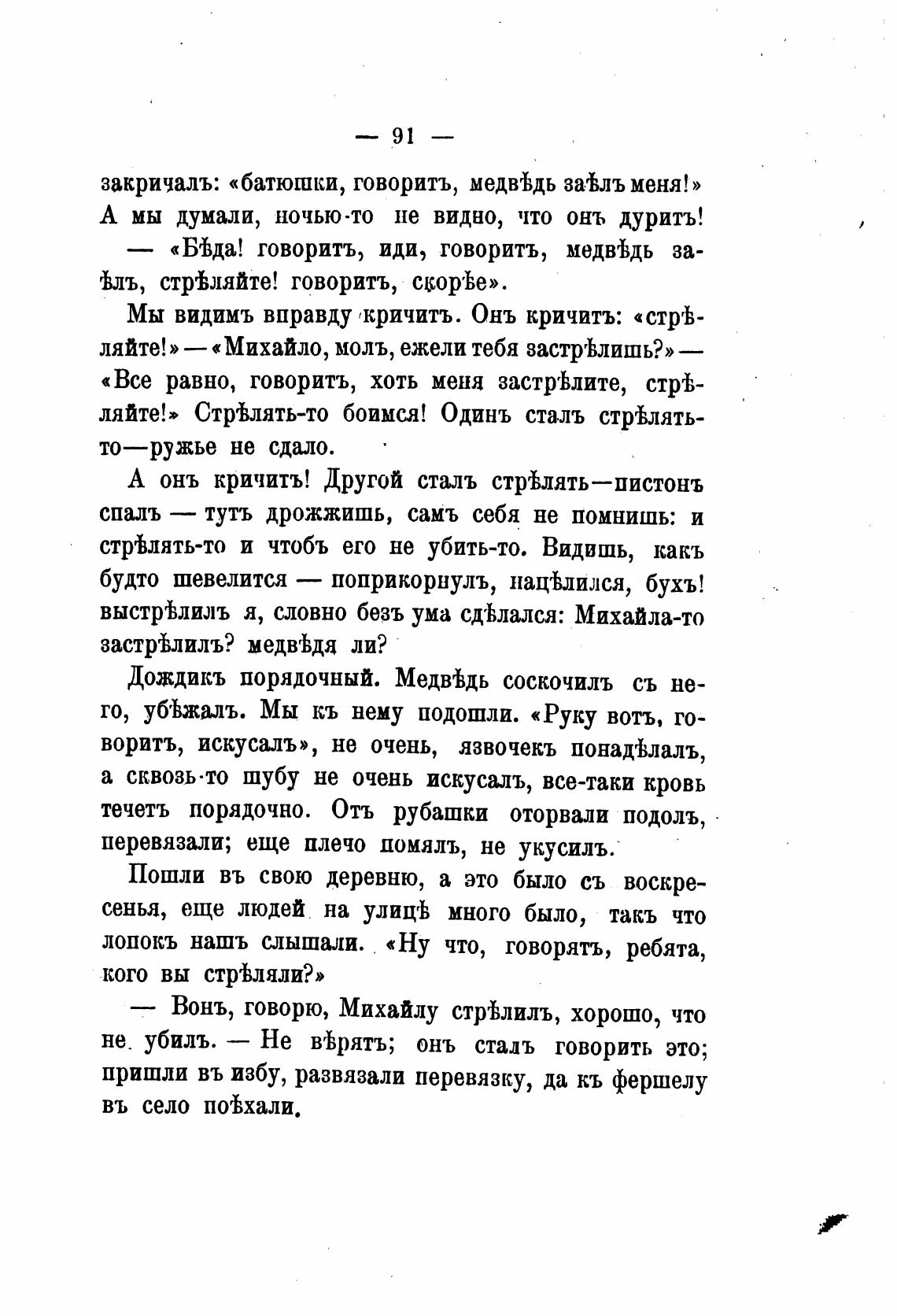 закричалъ: «батюшки, говорить, медвеЬдь заеЬлъ меня!»